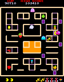Speaking of, a year later in 1983 Namco released Pac & Pal which would be their last maze-chase Pac-Man game until 1987's Pac-Mania, and it acts as an iteration of sorts upon Super Pac-Man but takes it in yet another direction, resulting in a pretty unique Pac-Man game. The lock-and-key system of Super Pac-Man is retained with the keys replaced by playing cards but the item number is reduced even more with mazes starting with six items to collect (two of those being power-ups!) from the locked-off areas of the maze, eventually getting to a maximum of ten, oh my. Furthermore, you can't just grab all the cards immediately- only three doors can be opened before you have to grab at least one item to open another. After the absurdly over-the-top giant-size Pac-Man from the previous game, the power-ups are a little pared-down but still quite different from the rest of the series- now you get different power-ups depending on the board such as the Galaxian flag-ship, the Rally-X car or another Pac-Man (?), but they essentially give you the same weapon, a short-range projectile that stuns ghosts for a decent amount of time. This won't send them back to the ghost pen like previous games, so you'll want to be careful not to have them sit somewhere inconvenient (you can pass by them when stunned at least) but you do get the advantage of being able to hit ghosts ahead of you and even through walls now! Your other major defensive tool is a covered-over upside-down-T-shaped area of the maze with unique properties- ghosts can only pass through it horizontally making the vertical intersection fairly safe and they'll also be slowed down just like the wrap-around tunnel in the original game (with you only able to see their beady eyes). Luring them in there though, you're on your own on that one but it's something to implement in your game-plan to stay alive. I can't say for certain that the ghost behaviour is vastly different from the original game- they definitely still alternate between 'scattering' to their own corners then moving into 'chase' mode with their own behaviours, with mode changes being indicated by them stuttering for a moment like in Super Pac-Man- but knowing the basics of their behaviour in previous games does give you an advantage.