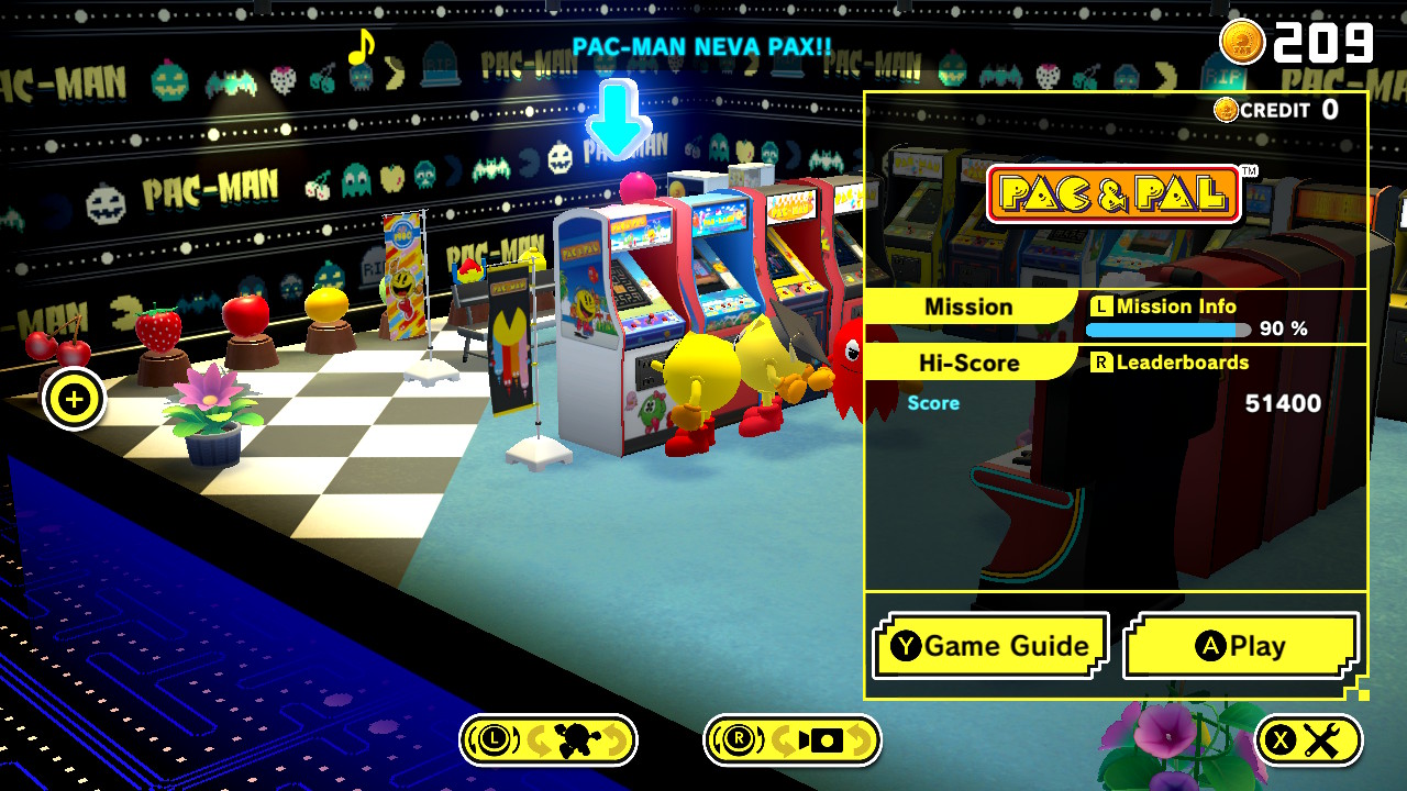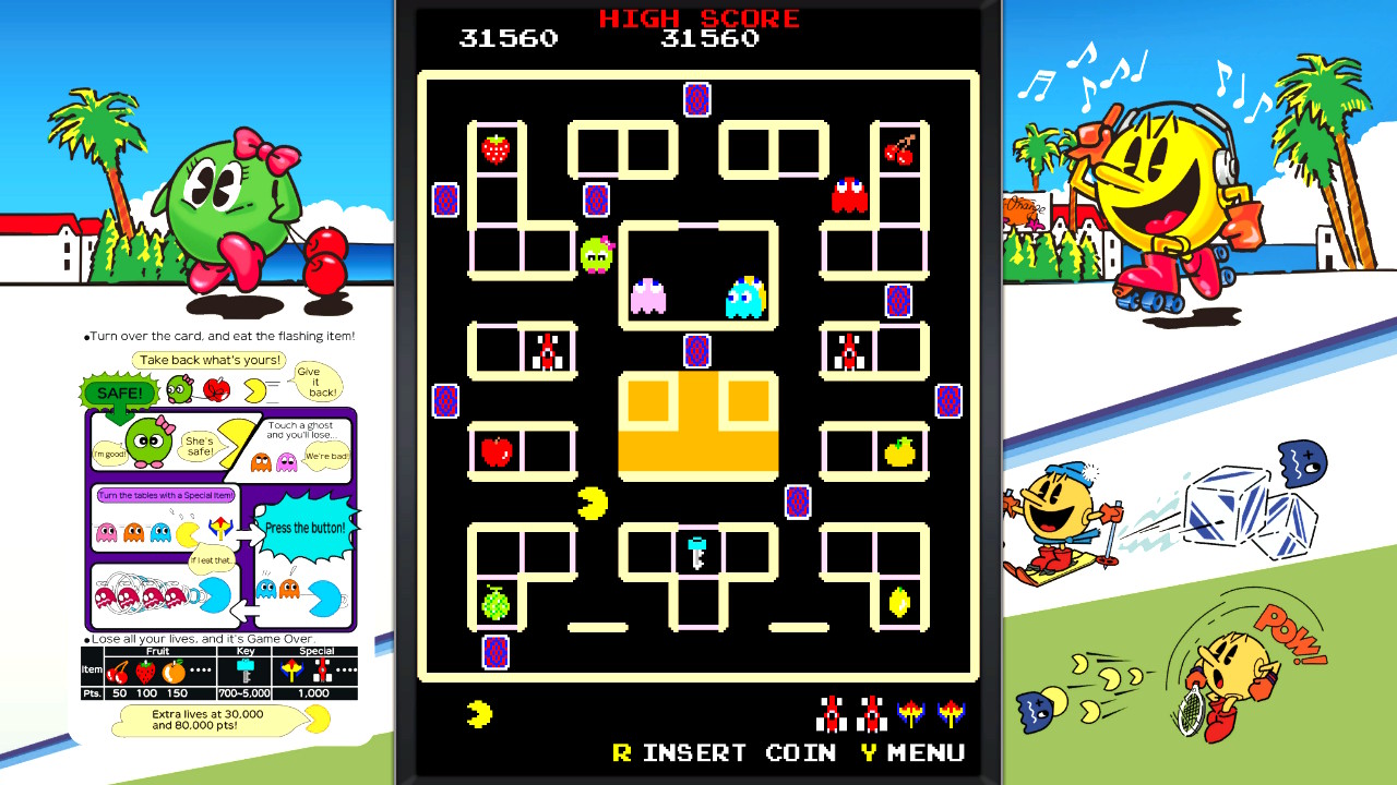 So this sure sounds like it should just be an upgraded version of the previous rerelease, but this iteration, developed by longtime Namco collaborators Now Production, is actually completely different. Most of the games from the first set are back (except Ms. Pac-Man, who was also removed from other games in this set due to ongoing legal issues) with a few more added but the Ghostly Adventures theming is gone, replaced with a customisable arcade that features a jukebox with unlockable music, a Gashapon™ machine (hey, they insist on the ™, not me) for getting new figures for decoration, a vending machine for more furniture and each game has goals to unlock more to make your very own arcade that is filled entirely with Pac-Man games. You also have to earn in-game coins to play until you achieve every single in-game goal for a free pass (good luck with that one, bozo, you'll be grinding Pac-Man 256 for a while) but the game is very generous with them at least. As for Pac & Pal itself- unlocked by playing Pac-Land twice- this version has screen resizing but no tate option on Switch and has no dip-switch options. Ouch. I've also had the sound glitch out on me a few times while playing (you can at least pause to fix it) but still, not great. The one bonus here is that the instruction card is translated, albeit only as part of the border art with no way to zoom in, which is a shame because it's amazing.