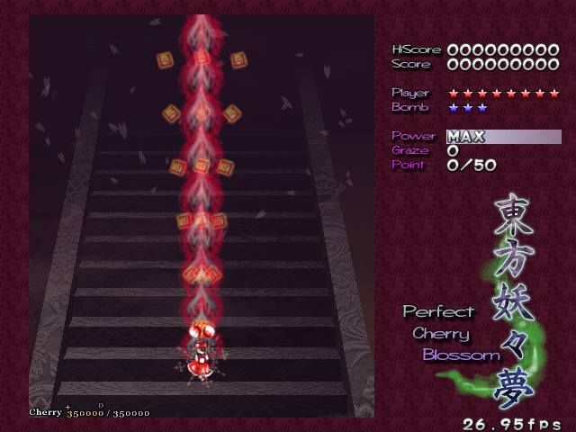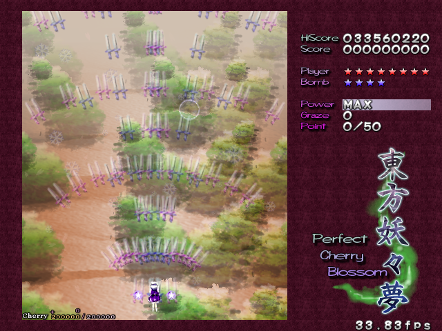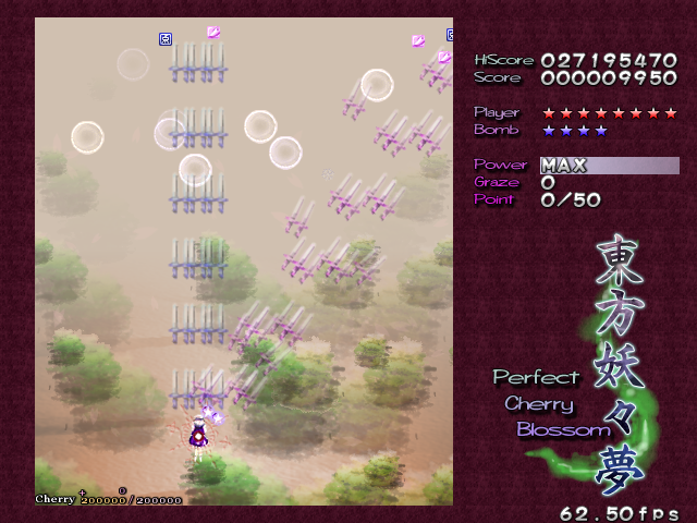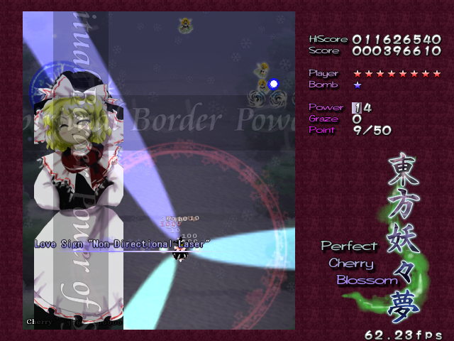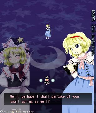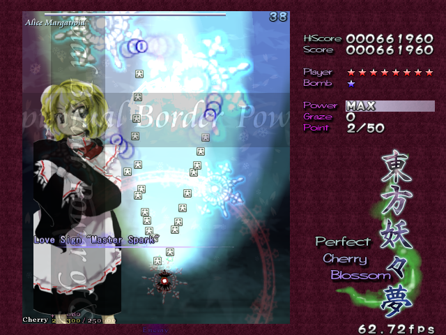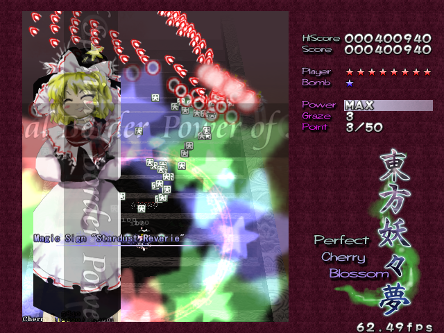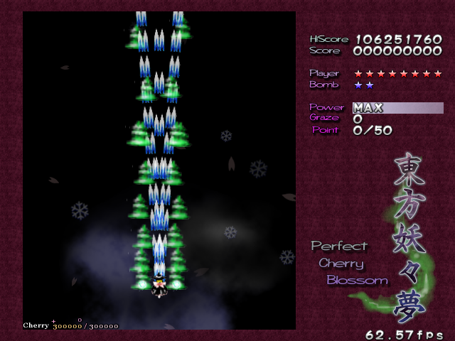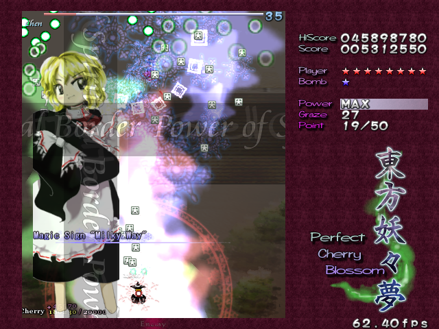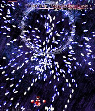 Sakuya stops time, and she freezes all on-screen bullets. You can graze them while they're like this, as Sakuya's speed increases greatly. When the bomb wears off, all frozen bullets become Star Items.