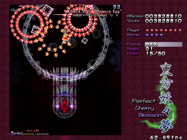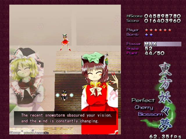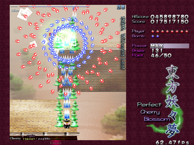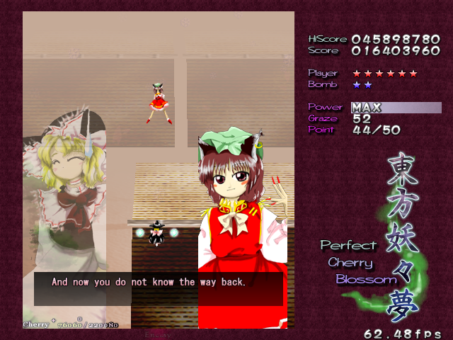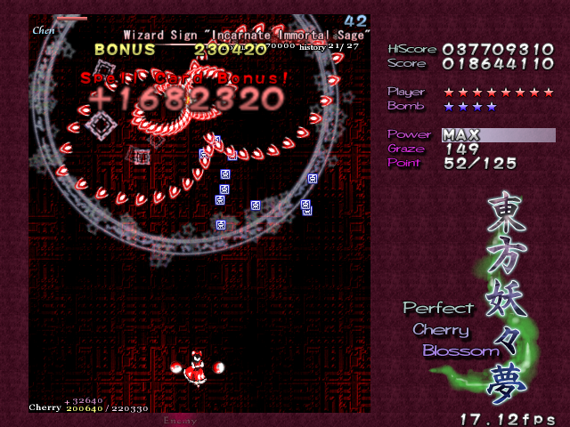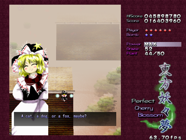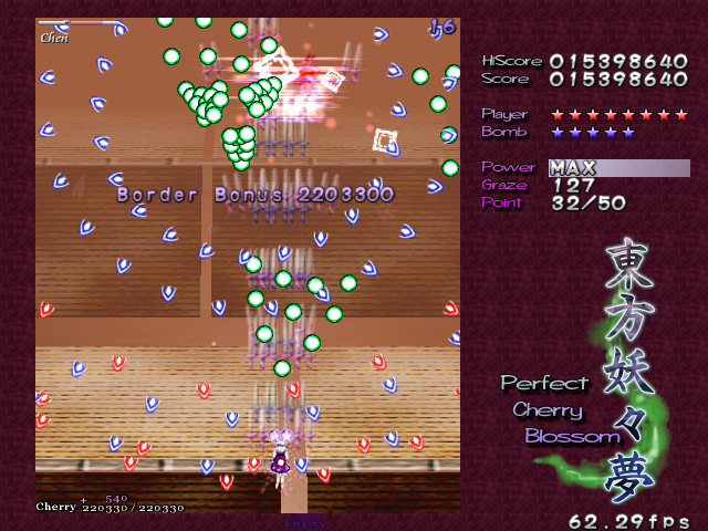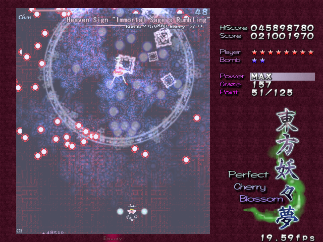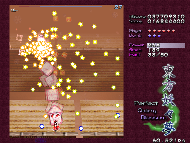 Yup, it's that screen-shaking nonsense again! All bullets on screen turn into the dreaded ping pong balls and make their way down the screen. The ping pong bullets are a little different from normal bullets, as it's almost like they adhere to gravity- they'll increase in speed as they fall down, and they'll move slowly to the left or the right, just like in real life. Needless to say, these can catch you out the first time you see then, but fortunately they'll only appear one more time in the game. When you adjust to how these bullets move, though, there's so many gaps that it's hardly a threat. Regardless, Chen repeats the pattern for the rest of this Spell Card, although the bullets she launches initially have a different pattern the second time around. This second pattern seems better suited to grazing, so if you hate these ping pong bullets as much as I do, get a Supernatural Border ready- partly for the points, partly for the protection...