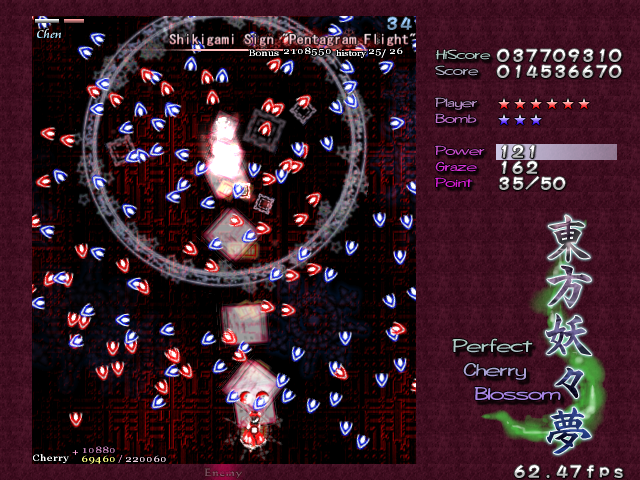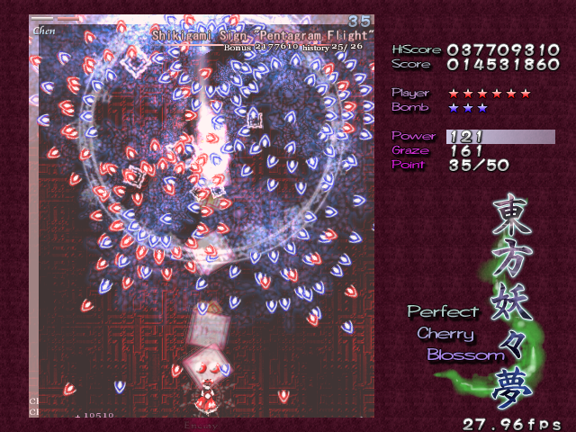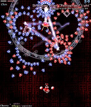 Chen's first Spell Card in this encounter, 'Pentagram Flight', seems to be standard fare when it starts- she'll charge up for a second or so (not nearly as long as before) and when she's done, she'll dart around in a pentagram shape, unleashing circle clusters of arrow bullets that fan out, spreading pretty far. In fact, aside from the pentagram movements, this is suspiciously similar to the 'Phoenix Egg' Spell Card from earlier in the stage! What a cop-out! Ah, but there's a twist here. She'll perform her little pentagram dance twice, and then suddenly...