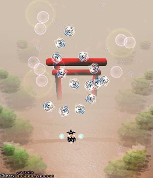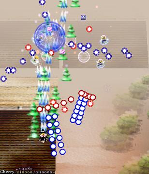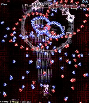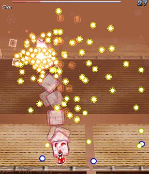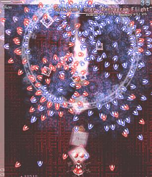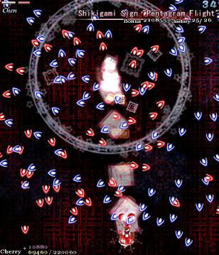 Chen makes the screen shake violently, and all the bullets on screen change trajectory- the blue ones lurch to the right, and the red ones curve to the left, heading down to the bottom-middle of the screen... Which is probably where you are anyway. Fortunately, since she makes it pretty obvious that she's going to do something when she shakes the screen, it's easy to see this one coming. Just try and remember that the bullets are going to come in from both sides, so don't focus on dodging all the bullets from the left- there's ones on the right, too! This Spell Card's over pretty quickly, since Chen doesn't move around much, so don't worry about it too much.