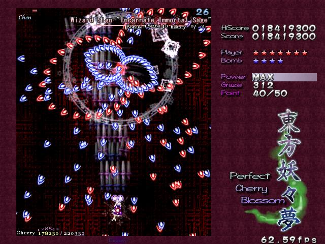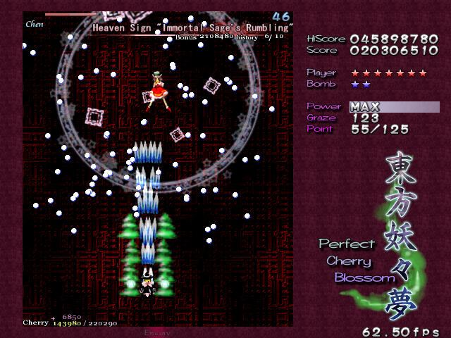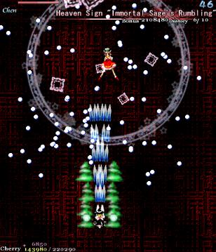 The next card, 'Immortal Sage's Rumbling', as well as having a completely ridiculous name, is a pretty annoying Spell Card, considering how early it is in the game. Chen does a little charging up again, then dashes across the screen, launching really slow bullets behind her. She'll zip on and off the screen, making it really difficult to hit her (unless you've got a homing shot) so, unless you really need to get some extra Cherry points for a Supernatural Border, it's pretty futile. After she's done zipping about, she'll stop at the top of the screen, and you'd think this is your perfect opportunity to lay into her. It is, but after a little charging on her part...