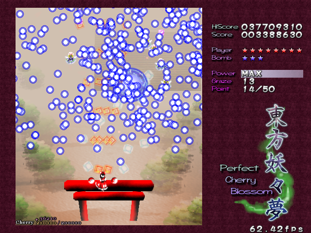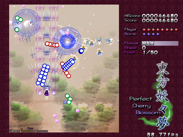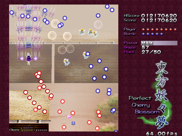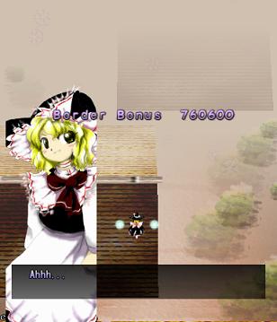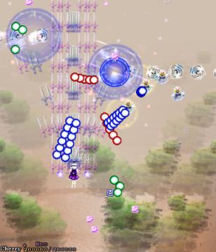 The next section of the stage is... Well, it's basically identical to the opening, fairies-posing-as-light-orbs and all. The only difference is that the spinners are gone, and there's just a load of fairies in your way that drift on-screen and actually fight back with spread shots, and the light-orb fairies put up more resistance, appearing in greater numbers. I've got nothing else to say about this bit, except that for those score-whores among you, this is the single most frustrating part in the game. It doesn't matter how long you've been playing this game, it doesn't matter how much of the stage you've committed to memory, and it certainly doesn't matter who you're playing as. When you get to this bit, you are guaranteed to get your Supernatural Border too early, and it'll end just as the light-orb fairies show up to launch their aimed shots at you, depriving you of a huge CherryMax profit. It will happen, and you will cry real tears (and you will take your frustration out on the upcoming boss).