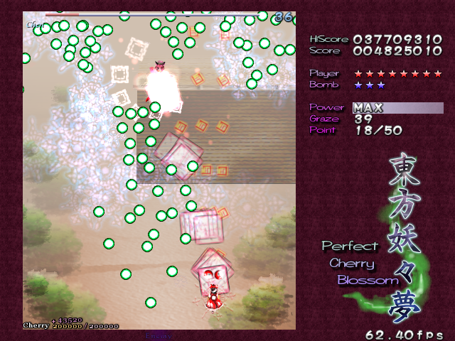 Stage 2 is barely a step up from Stage 1. Initially, a load of fairies show up, and they'll fire a few bullet spreads at you, but it's really nothing to worry about, eventually forming a small battalion which you can take down before they even think of firing. From there on, the majority of the enemy forces here are the spinners, and they'll move in from the sides of the screen in straight lines- they're easy pickin's, rip for getting some items from. However, you'll notice these eerie balls of light that float around, then multiply- these are fairies in disguise! When there's enough of them, they'll materialise and start launching big bullets at you, then scarper away. Use the floating light orbs to gauge when to go for the Point of Collection, and when to lay low- these fairies will definitely catch you out if you're not careful.