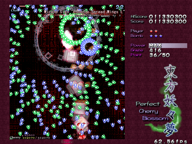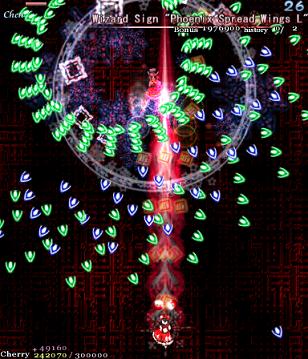 The Lunatic Spell Card here, 'Phoenix Spread Wings L', is similar to the normal one, except the arrow bullets are launched out in bunched rows and there's a hell of a lot more of them. They're also in much prettier colours, which only adds to the humiliation of running into one of them. Fortunately, Chen never learns her lesson about standing completely still before starting her attack, so feel free to go nuts and whittle her health away before she layeth the smackdown and kills you horribly.