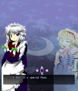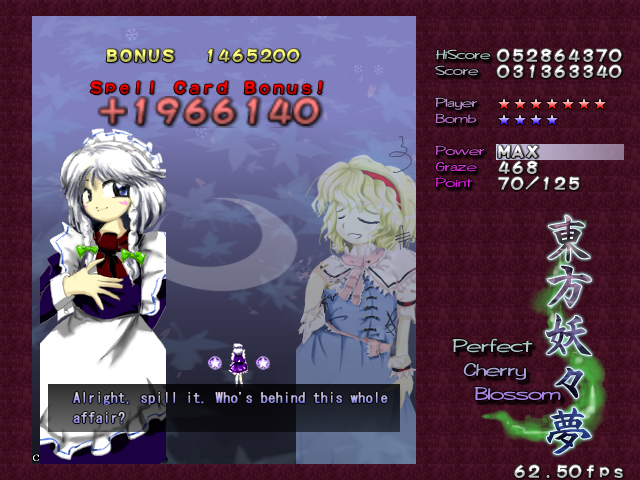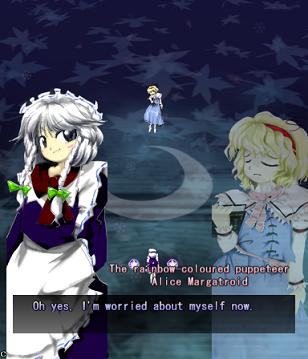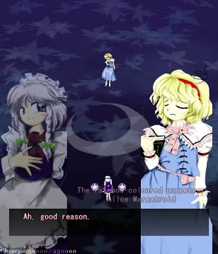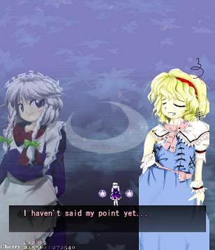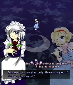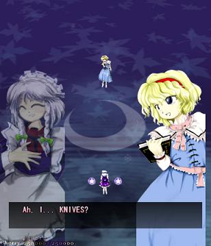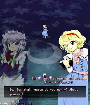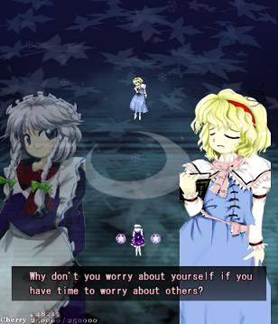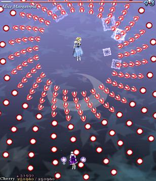Her first assault against you in this stage is pretty simple- she'll launch out several waves of big bullets that spiral outwards, with each line moving in opposite directions. Since the gaps between them are so huge, they're very easy to weave through. She'll do this twice, and then start throwing more bullets at you- this time, each 'row' has bullets moving both left and right, so not only do the gaps suddenly get much smaller, but they'll be coming at you from both sides. Fortunately, Alice doesn't move about too much, and her health bar's quite small, so just keep dodging and hitting her, and she'll scarper away like the coward she really is.