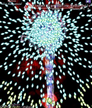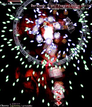 'Foggy London Dolls' is this Spell Card's name, and giving you grief is its game. Unlike almost every other Spell Card we've seen so far (and any we'll ever see) this one is just a load of bullets fired at you relentlessly, with no rhyme or reason to it. The only vague semblance of a 'pattern' is that every couple of seconds or so, the amount of bullets gets cranked up as Alice brings out more dolls out to fight, and it's these moments where this Spell Card is its most evil. If you think you can just memorise all the Spell Cards in the game and get through it fine, then 'Foggy London Dolls' is here to have a word with you. All I can say is that you can take solace in the fact that this is another good card to get a Supernatural Border ready for- although it's probably less profitable than 'Red-Haired Dutch Dolls', you might appreciate the safety net it gives you. Just hold on, keep dodging, and try to keep Margatroid in your sights- she moves around a bit in this one- and you might just pull through.