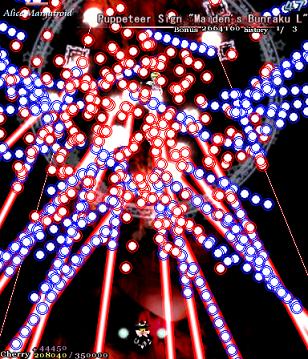 'Maiden's Bunraku' is a bit of an odd one. Calling forth her doll minions for the first time in this stage, Alice launches out rigid columns of big blue bullets in all directions as well as firing some more random red bullets, while her doll cohorts start setting up lasers for you to crash into. However! Alice's dolls aren't very bright, and they aren't very strong- if you pump them full of bullets quickly enough, you'll destroy them (and get some items in the process) and they won't spew lasers at you. Aside from that, just keep an eye on the red bullets and you'll be fine here.
