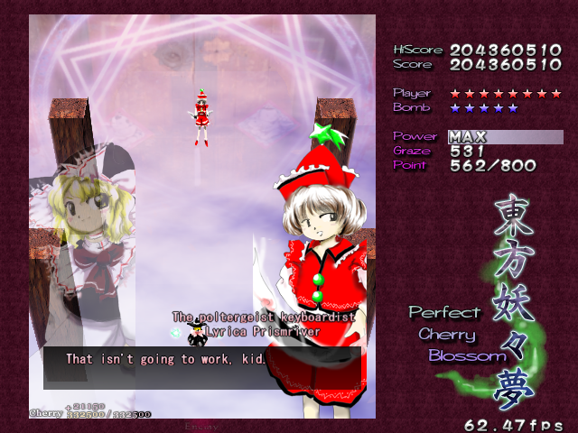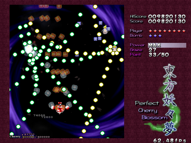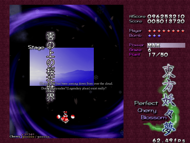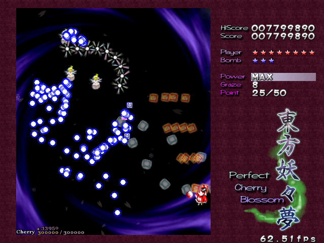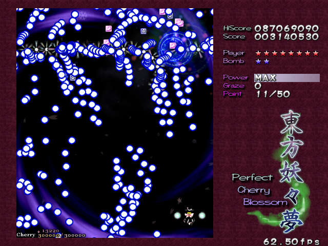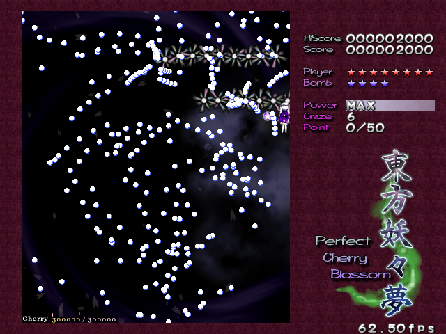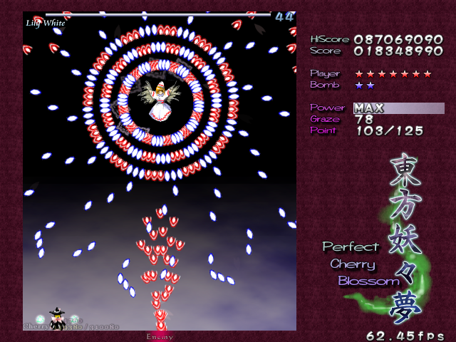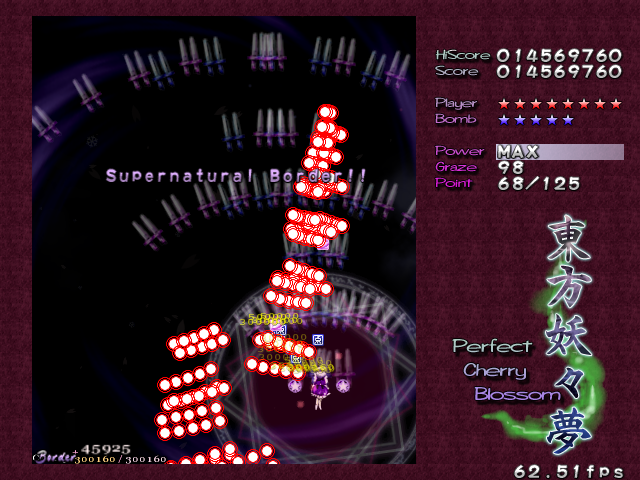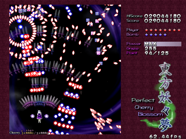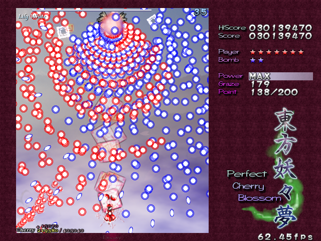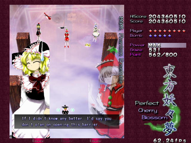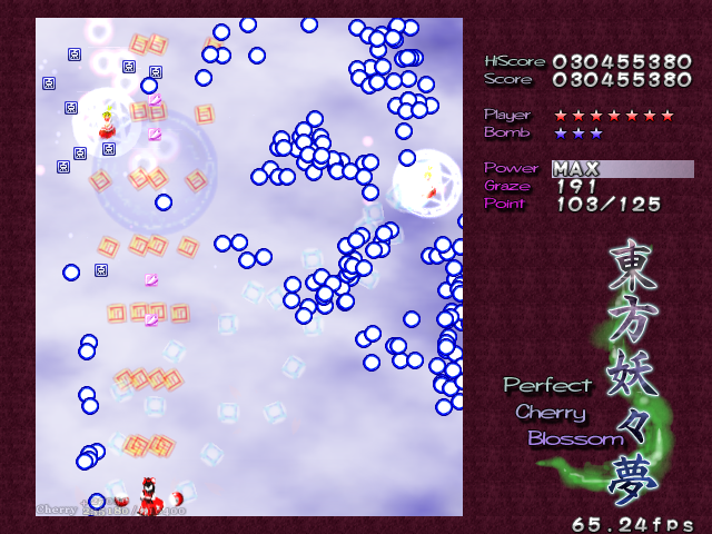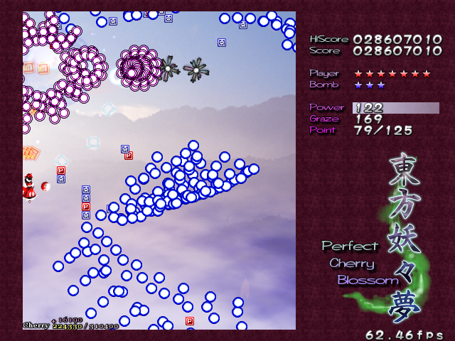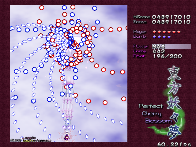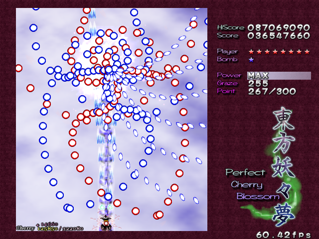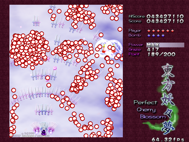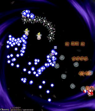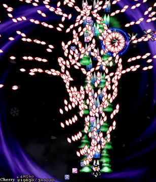 In most Touhou games, Stage 4 is the turning point- from here on, the game gets pretty brutal. Perfect Cherry Blossom isn't an exception, but seems to go above and beyond the call of duty to teach you new forms of pain, as Stage 4 is, by far, the longest in the entire game. As such, I've had to dedicate two pages to it- one for the pre-boss warm-up, and one for the boss fight (or bosses, rather...?) itself. Get ready for a long, harrowing journey into bullet chaos, because Stage 4 doesn't mess around- it's going to kick your ass if you're not ready for it.