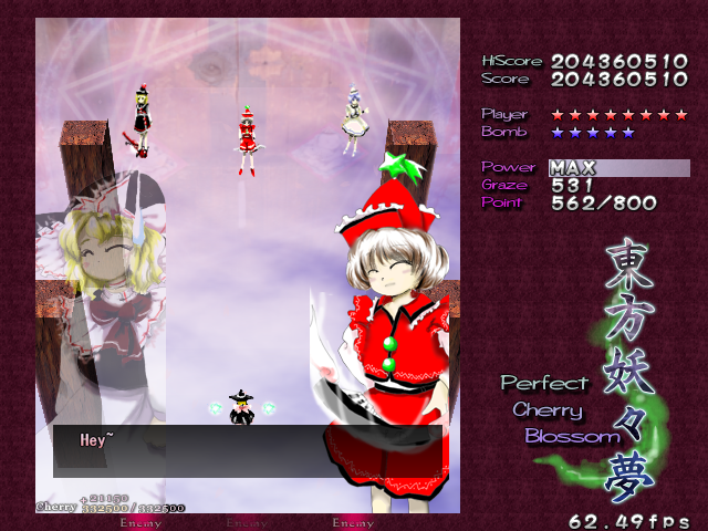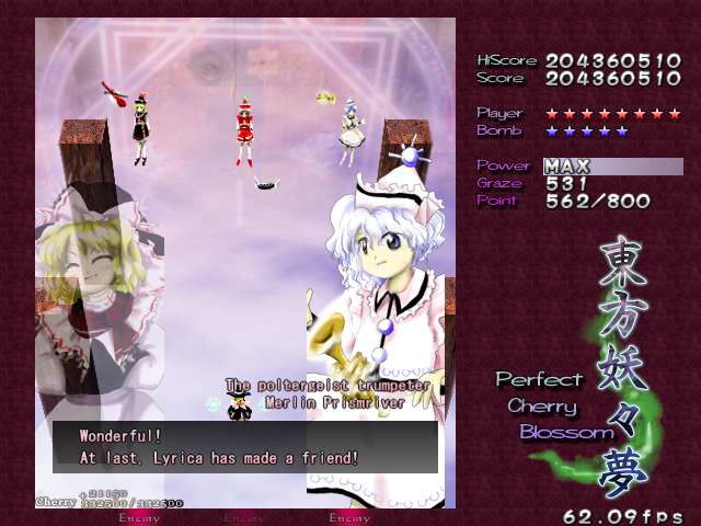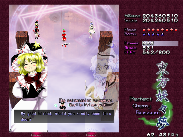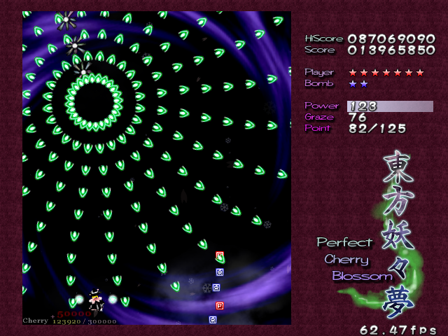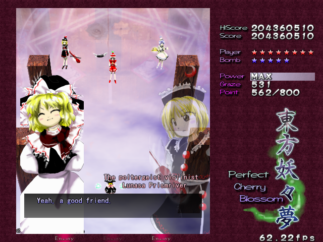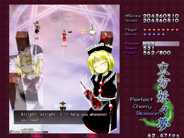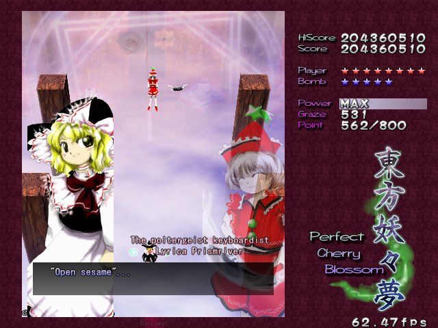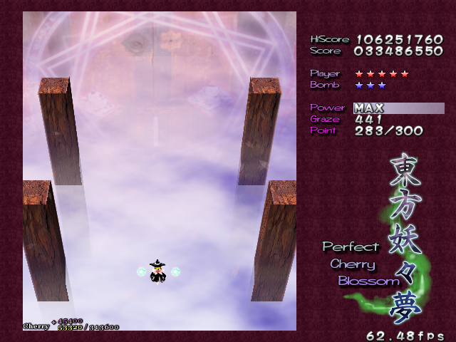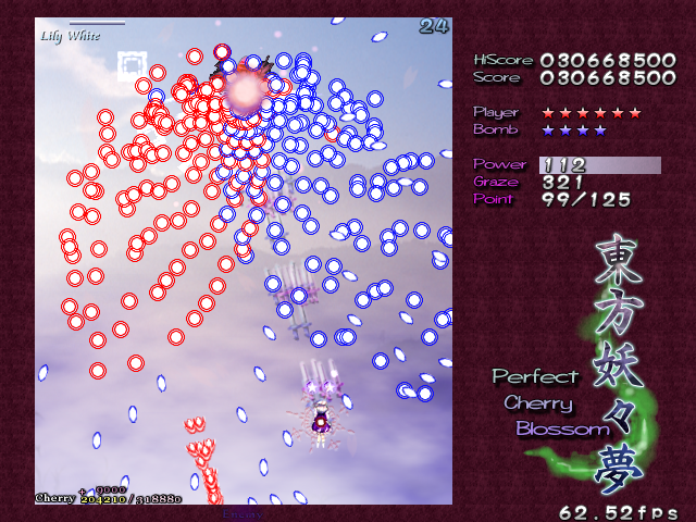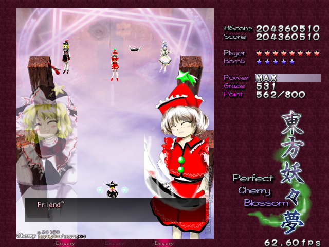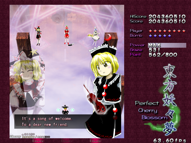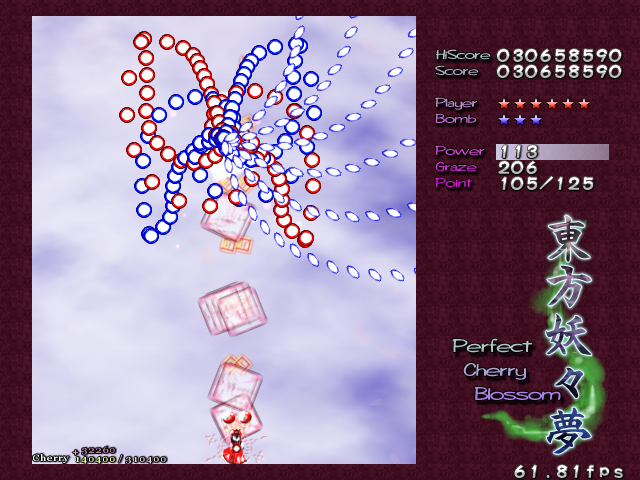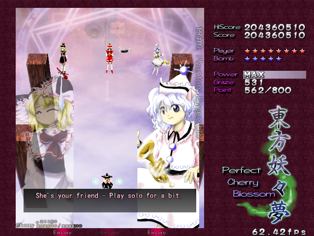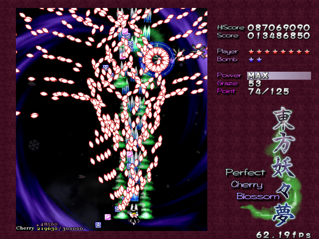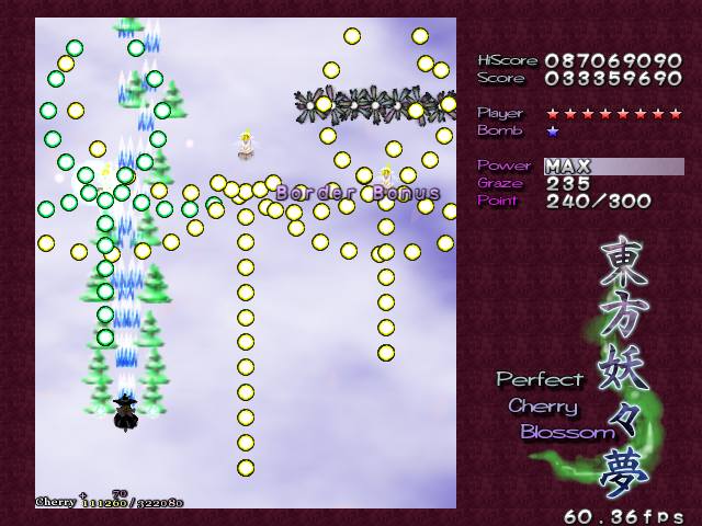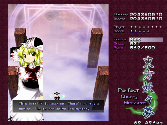 In most Touhou games, Stage 4 is the turning point- from here on, the game gets pretty brutal. Perfect Cherry Blossom isn't an exception, but seems to go above and beyond the call of duty to teach you new forms of pain, as Stage 4 is, by far, the longest in the entire game. As such, I've had to dedicate two pages to it- one for the pre-boss warm-up, and one for the boss fight (or bosses, rather...?) itself. Get ready for a long, harrowing journey into bullet chaos, because Stage 4 doesn't mess around- it's going to kick your ass if you're not ready for it.