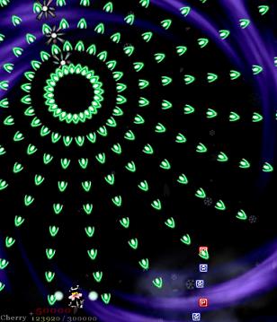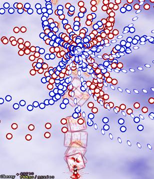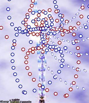 They combine all three bullet types, just to dick with you. If you want, you can try dealing with them in the same way as always- streaming across the bottom of the screen- but the blue sphere bullets are very likely to catch you out. It's a bit easier if you move from the bottom of the screen and remind yourself that yes, there are other parts of the screen you can move to. If you don't stop moving, there's plenty of space to fit through, so it's not really that hard, but it's vital you don't get stuck in a corner- if that happens here, you're going to die, and only divine intervention is going to get you out alive. I pulled it off once and nearly made it out alive until a stray red bullet drilled itself into my side. I wasn't happy.