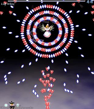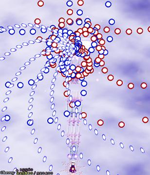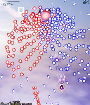 Lily happens to be very useful in this stage, though- she's a bit of a breather from the literal bullet hell you've just been through. She's a total pushover when you know what you're doing. She'll start by launching out this wonderfully pretty circle pattern, which quickly changes- half the red bullets wander off, as do the diamond bullets, but the remaining reds home in on you, all scrunched together. Lily then teleports and repeats the process 4 times before she teleports back into the middle of the screen and launches a huge blitz of bigger red and blue bullets. Lather, rinse, repeat. I don't think I need to point it out now, but this encounter is a graze maniac's dream, so exploit it while you can- this is one of the last opportunities to really graze without too much risk.