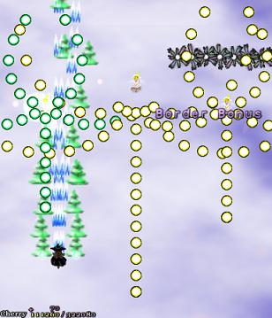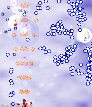 Finally, the fairies stop mucking about and get out the big guns- two of them dash on screen and launch lightning-fast clumps of blue bullets in all directions, then two more dash in and repeat the process. All the while, spiky things flit from side to side, although fortunately they won't do anything this time. How are you supposed to survive such a brutal attack? It's actually really, really easy, and when you finally figure it out, you'll kick yourself- just stream the bullets. That's it. Just inch along the bottom of the screen, herd the bullets away from you, and keep firing. When four of the fairies have attacked, they'll give you a few seconds to catch your breath before repeating the pattern, so use that time to grab the items the spiky things leave behind. By the third wave, they'll swap their tactics and use the faster, more numerous red bullets, but the same rule applies- herd that shit like a ranch-hand from Texas!