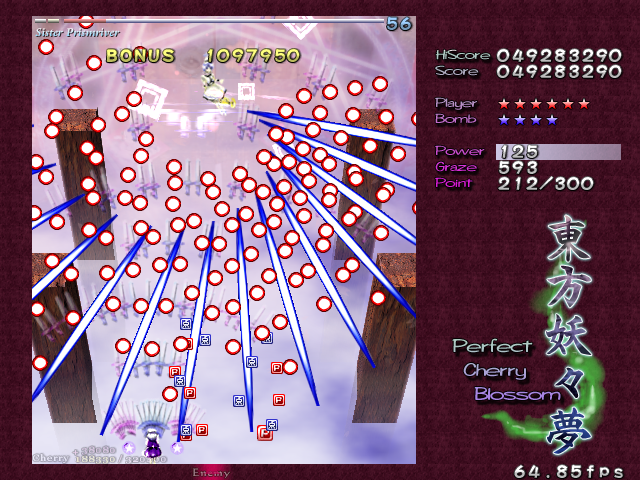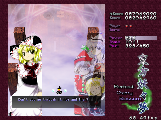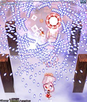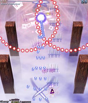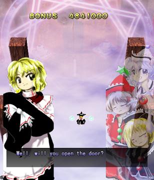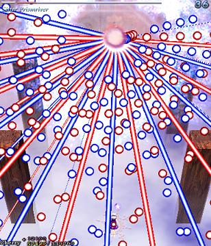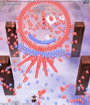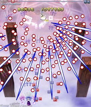 Let's have a look at Marisa's set next then, shall we? She gets to fight Lyrica Prismriver who's a little from Column A (piss-easy) and a little from Column B (balls-nasty). She starts out with the balls-nasty crossing the streams nonsense- she generates gigantic swirling vortexes (or is that vortices?) of bullets, makes 'em spin around a bit just to mess with you, then sends them out, and at this point you realise that the different colours are heading for you in opposite directions and you promptly panic and die. The best approach is just to wing it and improvise... Or, if you want, just bomb it. It's not like you're going to need those things for anything else, right?