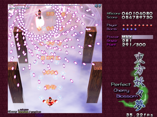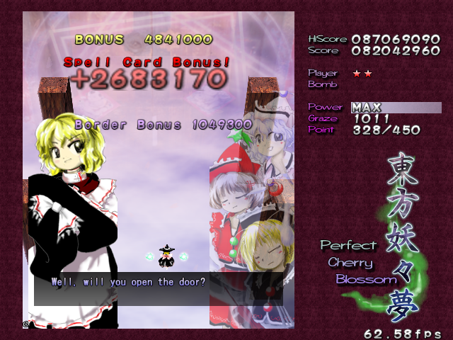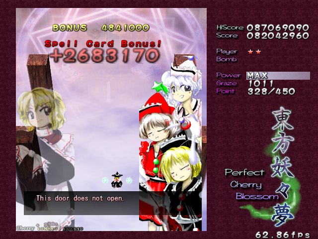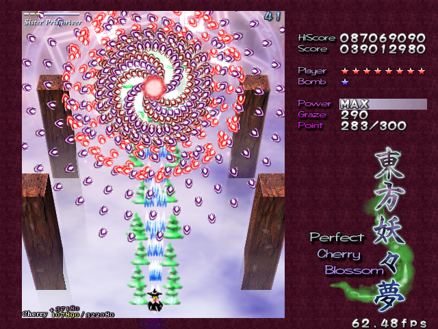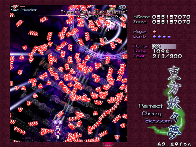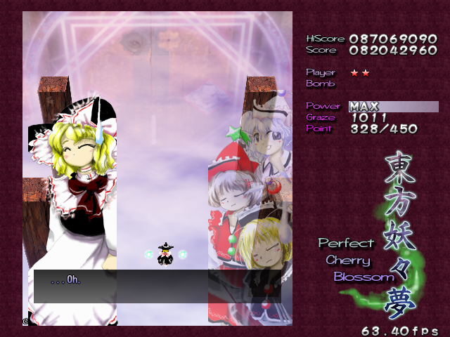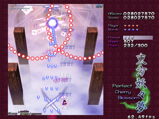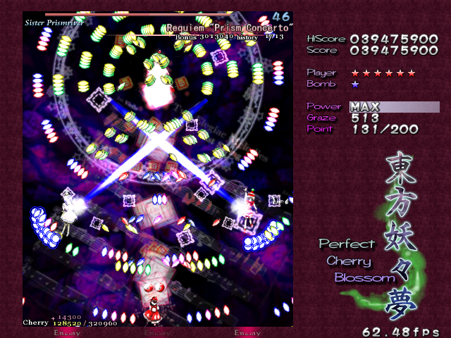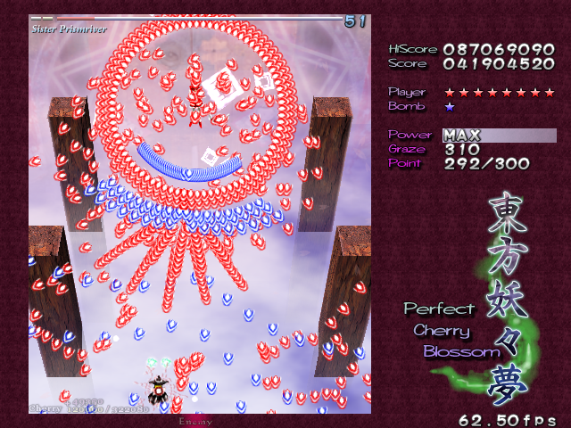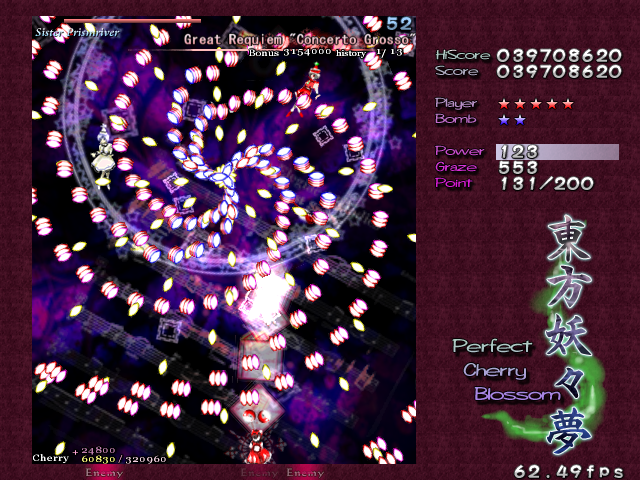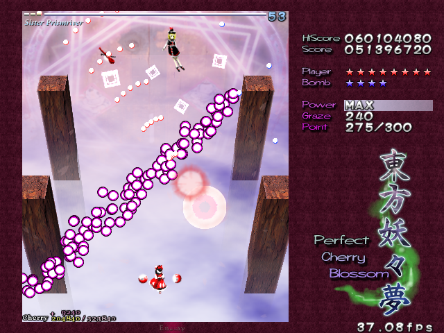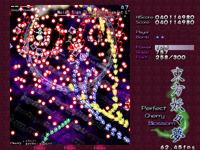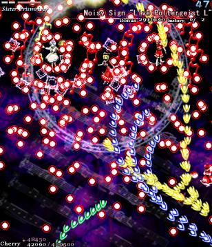 Often in the Touhou series, Stage 4 has some sort of 'gimmick' with the boss depending on who you're playing as. In Perfect Cherry Blossom, the gimmick is that each character fights a different Prismriver sister at the beginning of the fight, and each sister has 2 different bullet patterns before they team up for a spell card, which every character has to fight. As I'm nothing if not impossibly thorough, let's tackle all of them. Since there's so many of them, though, I've only supplied one picture for each of them- I guess if you want to see more, you'll actually have to play the game, won't you? First up to bat, it's Reimu.