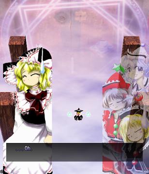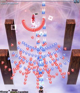 'Prism Concert' is the name of this Spell Card, and the sisters take their positions- one of them (the same one you fought at the start... Again) moves up to the top of the screen and starts firing out itsy-bitsy diamond bullets arranged in itsy-bitsy rows, and the other two sisters get closer to the bottom, one on each side. After a few seconds of dawdling, they'll break out their aforementioned lightsabers and stick 'em out in front of them- any diamond bullets they touch turn into kunai bullets, changing their trajectory- at the start, it'll simply straighten the rows out (painfully easy to dodge) but as the fight goes on, they'll start moving around a bit and flaunting their Jedi skills, sending the diamond-turned-kunai bullets all over the shop. They'll stop sticking to their oh-so-organised rows, and the whole screen becomes totally chaotic! The only tip I've got is just to keep pounding the Sisters until they give up, and hope a stray bullet doesn't drill a hole through your head.