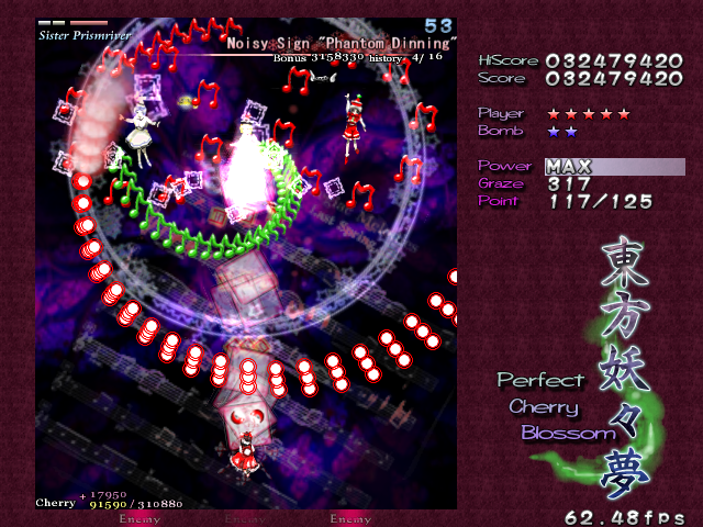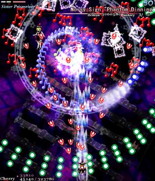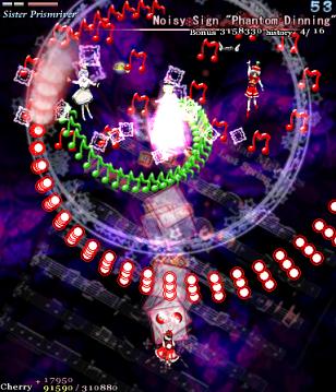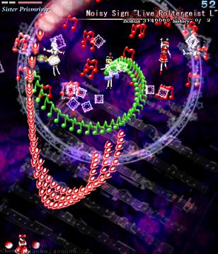 Once you've beaten whichever Prismriver Sister you had to fight, their powers combine to summon Captain Planet to wail on your ass together with their team Spell Card, 'Phantom Dining'. It's a shame, then, that they apparently make the worst enemy team in any video game, because this Spell Card is absolutely pants... When you know how to handle it. Much like everything in this game, but I'm digressing. The Prismriver Sister in the middle (the same one you fight at the start) fires a spread of musical notes at you that explode into columns of big bullets- the gaps between them are big and plentiful... For about 5 seconds. Then the homing arrow bullets appear out of nowhere, which doesn't make things hard- only interesting as you have to flit between the columns of bullets and keep the homing arrows at bay as well. Just take big, long strides from left to right, and you'll prevail.