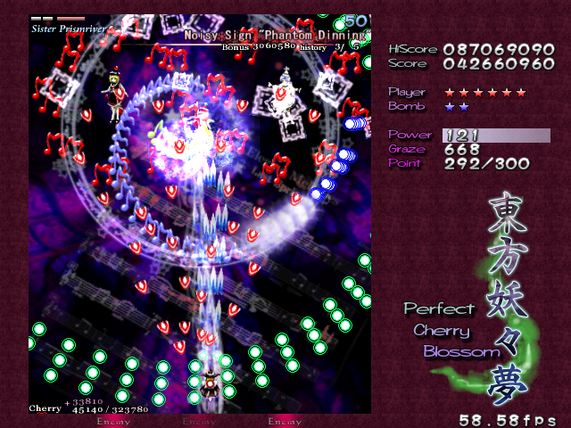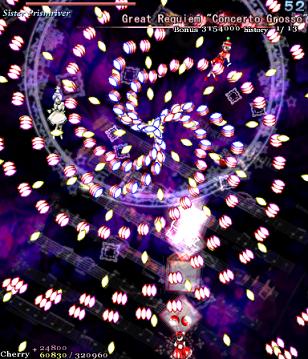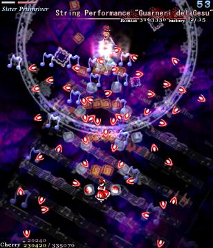 Next up, a Spell Card that's similar in principle to Lunasa's very first attack on this stage, i.e. focused on filling the screen with slowish bullets that absolutely overwhelm you, making you thankful for the fact that your hitbox is only 5x5 pixels big. 'Guarneri del Gesu' (whatever that means) sees the return of musical notation death- red musical notes drift on-screen and then explode into 3 arrow bullets, then silver music notes follow suit, exploding into a spread of sphere bullets. Lunasa really doesn't let up here- the second one set of notes explodes, the next set is on your ass but, fortunately, none of them ever seem to spawn on top of you. They'll definitely spawn right next to you, but never on top of you. At least she plays fair. Just remember- don't stay at the bottom, move around, and you'll live.