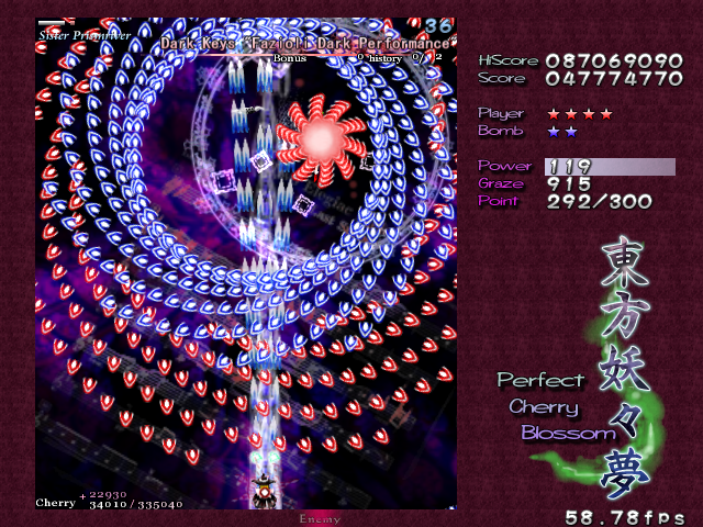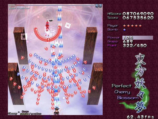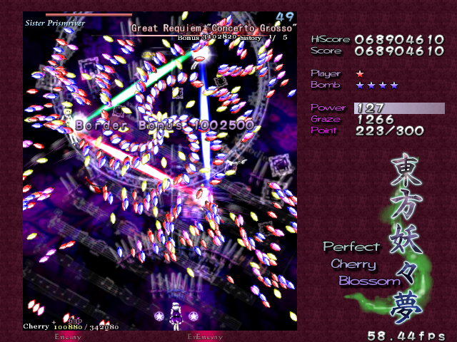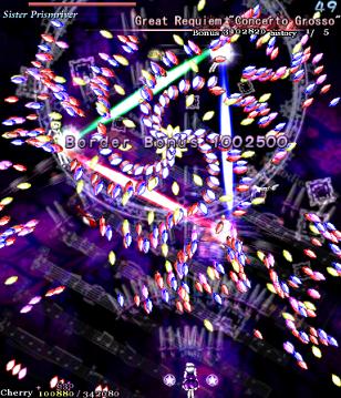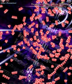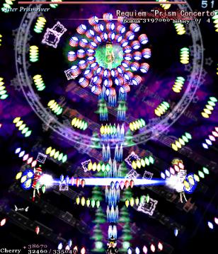 Lyrica is a very disappointing fight- it's honestly juts more of the same attacks she had earlier. The first attack is nearly identical to the second attack from her first assault, but it's just a tad slower, and that's terrible. As for her Spell Card here, 'Fazioli Dark Performance'? It's more of that crossing the streams nonsense, very similar to her first attack on this stage, but to be fair, she definitely cranks it up a notch. It makes a much prettier swirly pattern, and, er, it seems to cover far more of the screen. From what I've seen, the best place to be is the far-left/far-right corner. That's all I've got to say about this- very poor show.