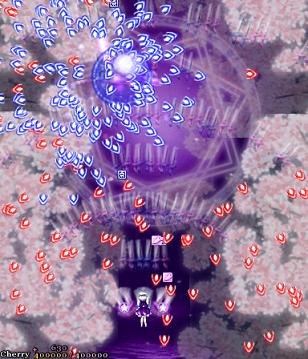 As this is the final Spell Card in the game, you'd expect it to be utterly impossible. Amazingly, ZUN has decided to show a little, dare I say it, mercy, and so this isn't as bad as you might think. Yuyuko launches out a tightly-packed cluster of bullets that don't require much weaving to avoid, then she'll fire off 4 waves of stacked red bullets that move slightly to the right or the left- this is the hard part of this attack, but the trick is to remember not to move too much, otherwise you'll walk right into it. While all this is happening, you'll be hemmed into the middle by the lasers to the side, which increase in number as the clock ticks down... That's all there is to it, she'll keep repeating this until it's over.
