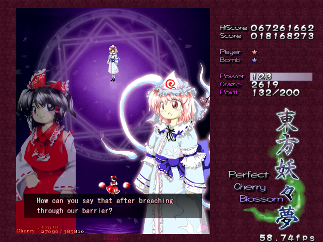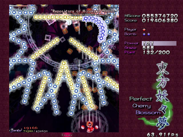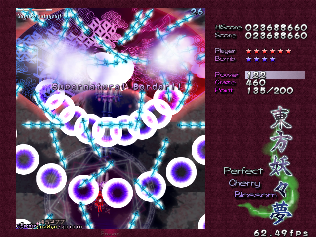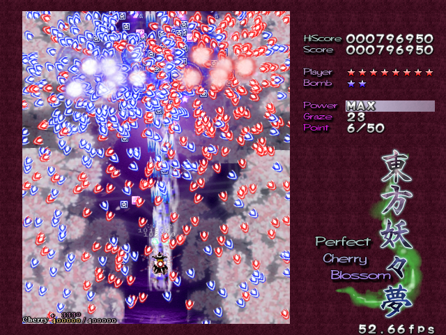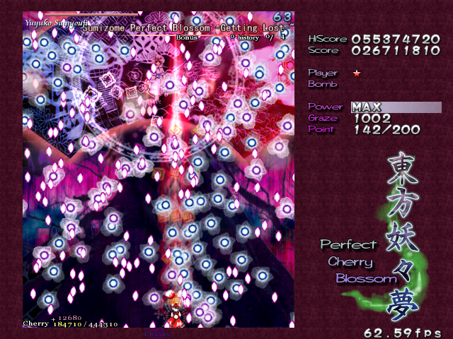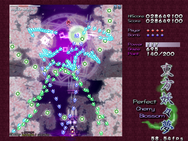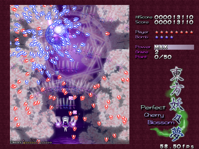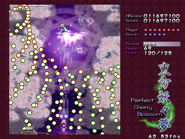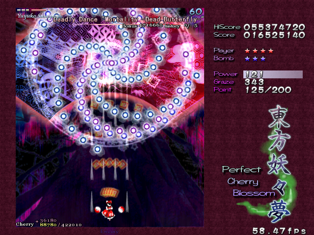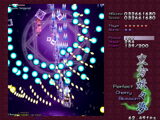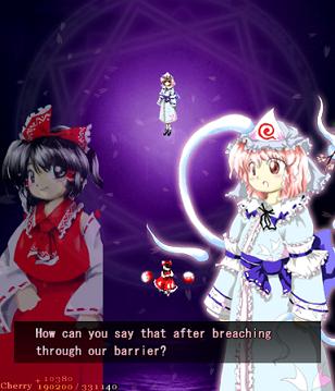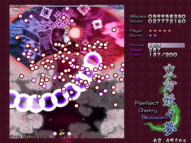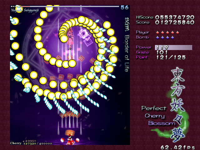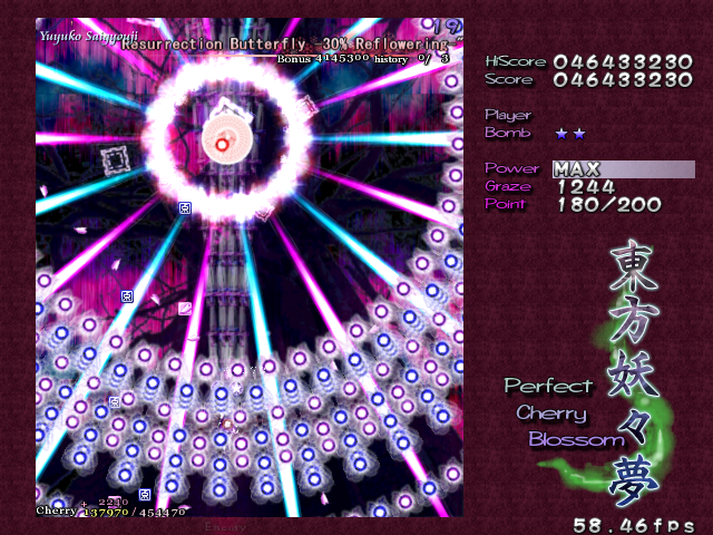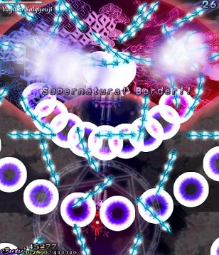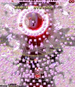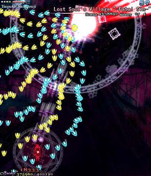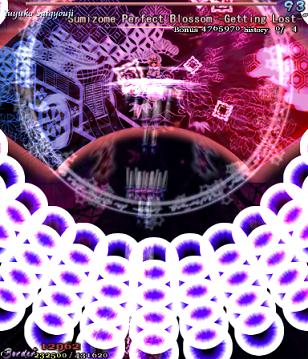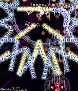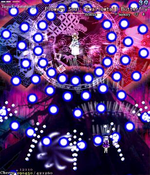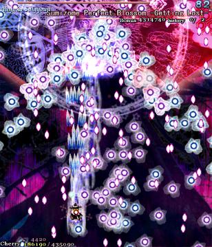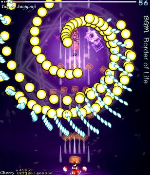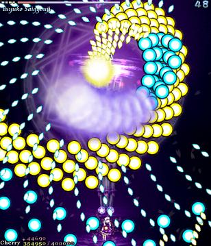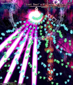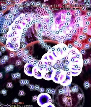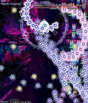 As Yuyuko is the final boss of the game, you're probably expecting a harsh fight, and a harsh fight is exactly what she gives you- she has five life bars, six Spell Cards and ten different attack patterns in total. This is a bitter fight until the very end, so bring everything you've got to this one! Her opening gambit is a bit unnerving really- if you're playing to beat this son-of-a-bitch, then you're probably frazzled by this point, and something like this is the last thing you need. The pattern revolves around her launching streams of diamond bullets, coupled with spreads of sphere bullets, and while the sphere bullets seem to be the main threat, the diamond bullets are aggravating- they're designed to seal off gaps between the spheres. When she starts launching out the bullets like crazy, as demonstrated by the screenshot to the right, there's often just a pixel or two in it.