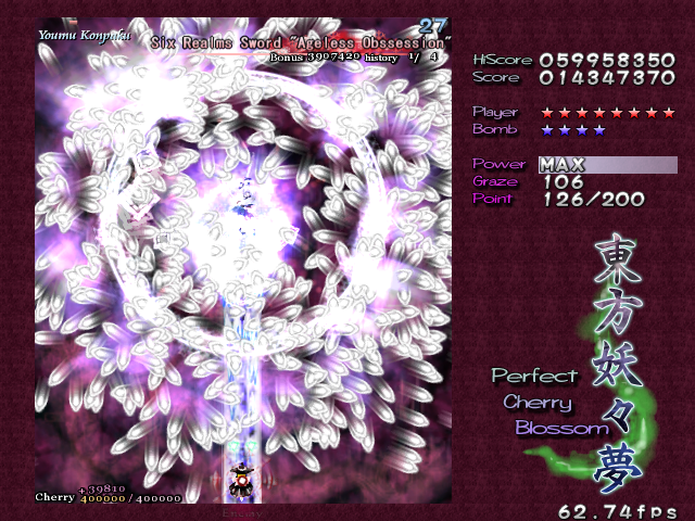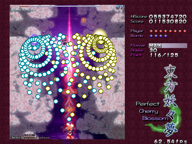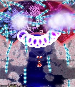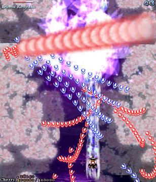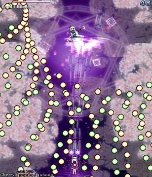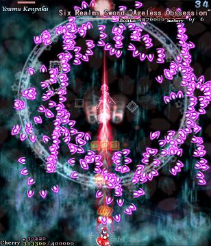 The last-ditch resistance from the ghost fairies is similar to the attack they were using at the start of Stage 5... At least, for the first 2 attacks. From there on... Well, just look at that screenshot to the right. It's enough to make you ill, isn't it? Fear not, because soon after, Youmu comes back to kick you into touch again, dispelling the majority of these bullets. You can also get quite a lot of Point Items from this bit if you keep shooting while trying to survive...