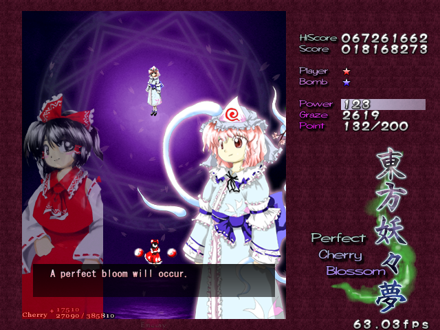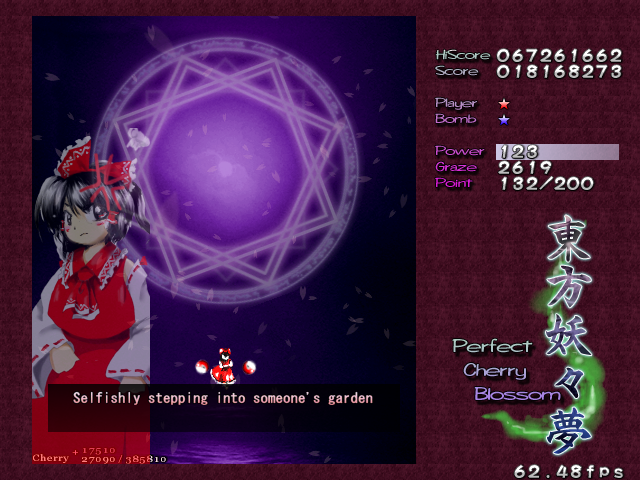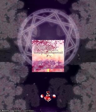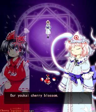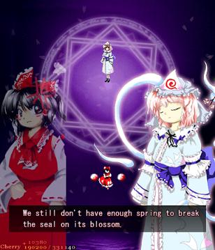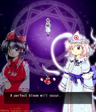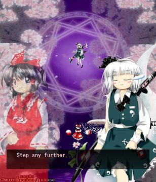 Well, after those pretty cryptic messages, it's time for the final assault. Don't be distracted by the cherry blossoms- this beautiful flower garden is the setting for the end of the game, and presumably where the 'spring' of Gensokyo is being held. Since Perfect Cherry Blossom isn't one of your old-school shoot-em-ups, there's no extra-long stage here, no boss rush, no tricks- you've got one fairy gauntlet to run, one mid-boss to beat up, and then the final battle... Let's hop to it, then, and get Gensokyo's spring back!