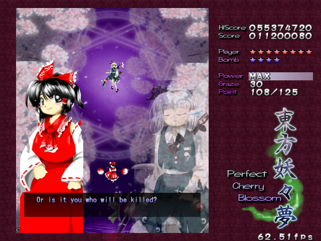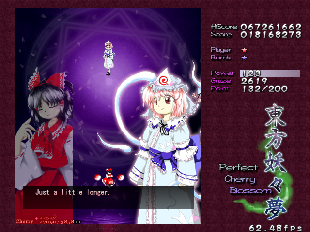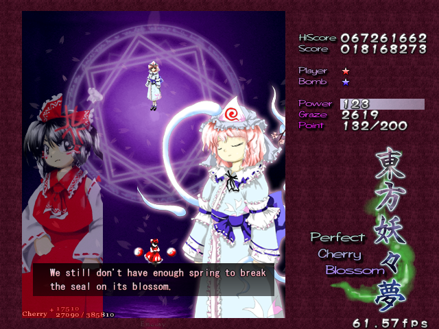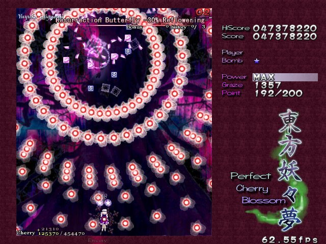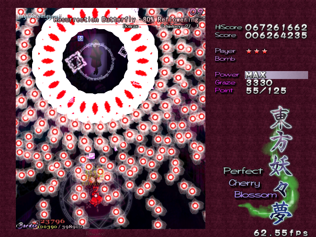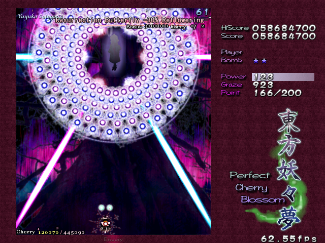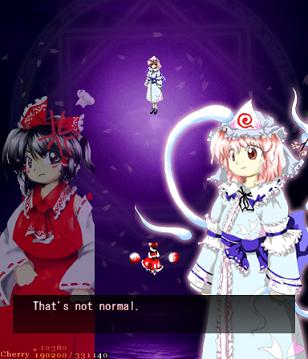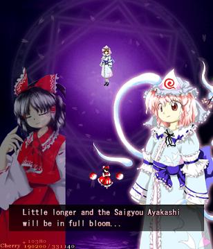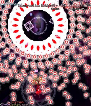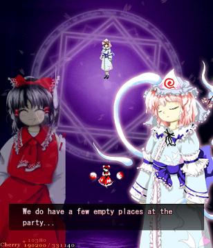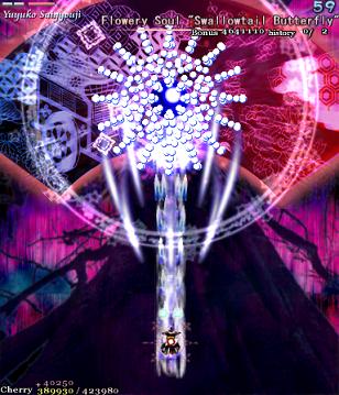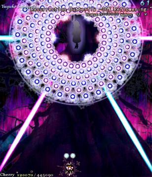 Ha ha ha, oh man, you actually thought it was over! Yuyuko's real final Spell Card, 'Resurrection Butterfly - 30% Reflowering', is a little different from the others in the game. If you think filling her with bullets is going to help you, then you can forget it- she's turned into a shadow, so you can't hit her. If you're wondering how you're supposed to get her life bar down when you can't hit her, then you're thinking about this totally wrong- she doesn't have a life bar anymore! Rather than killing her, you've simply got to survive this attack until the timer goes down, ending the game. Usually, this would mean you lose your Spell Card bonus, but this is an exception.