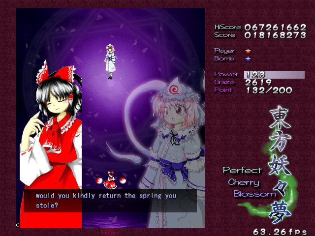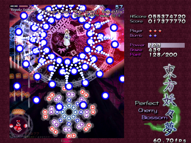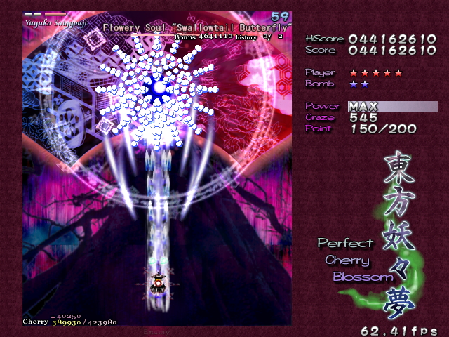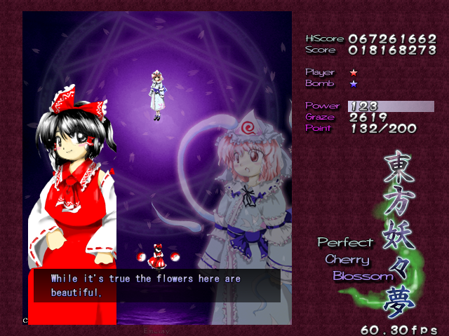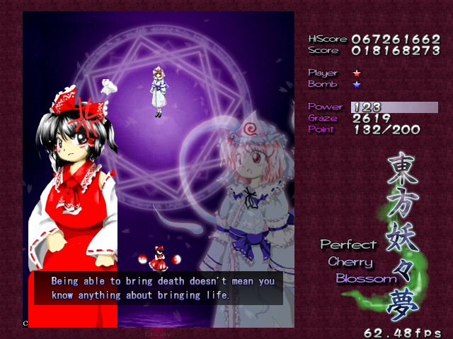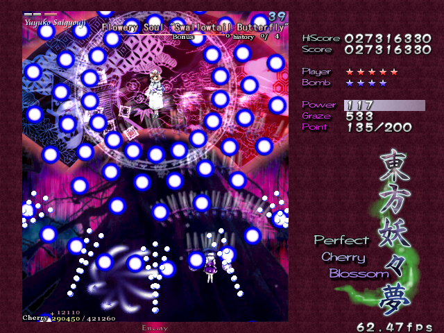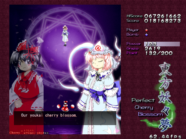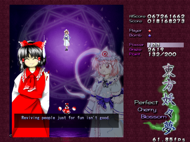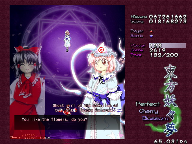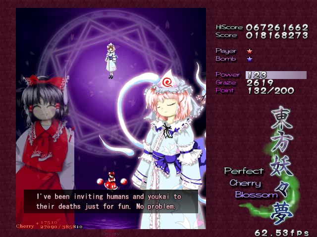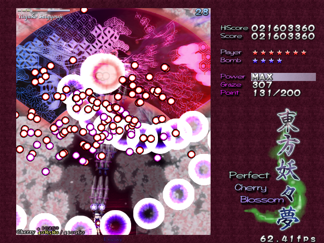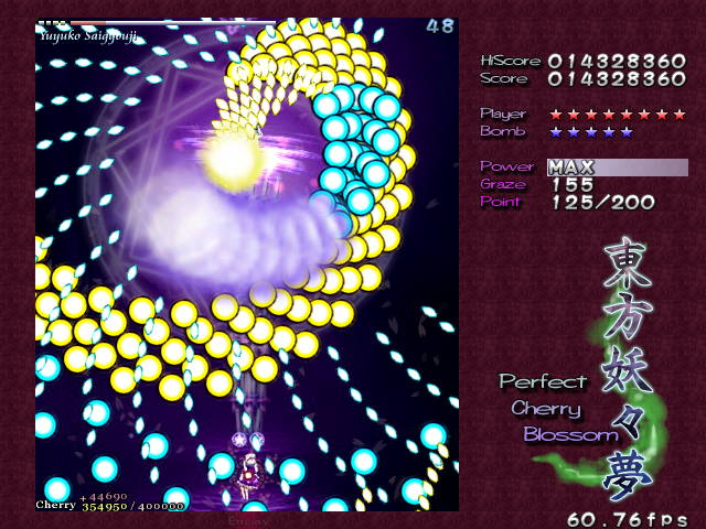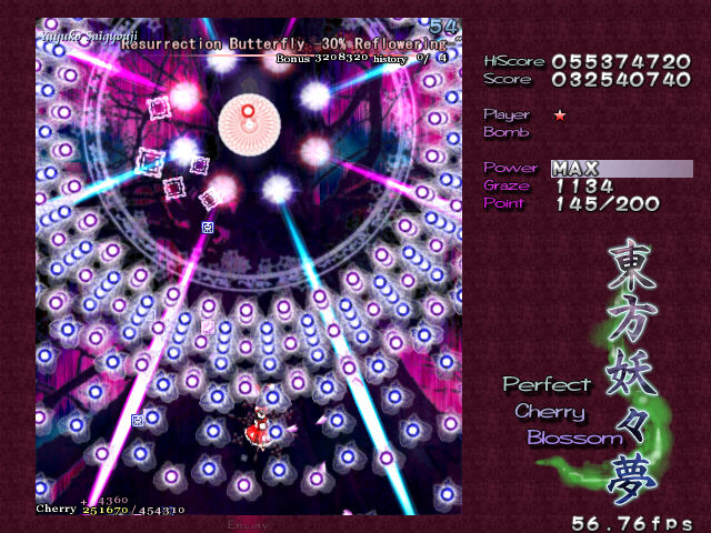 And now, it's time for my favourite Spell Card in the game, 'Swallowtail Butterfly'. Every now and then, amongst all the difficult Spell Cards, ZUN throws you something that's really a cut above the rest, something that hasn't been seen often in a shoot-em-up, and in Perfect Cherry Blossom, this is that Spell Card. Throughout this card, you'll be pestered by 8 lasers that home in on your location, explode into a nice little bullet pattern which expands then retracts, then home in on you again, and so on, until you beat Yuyuko. While this is happening, she'll still be firing out waves of big bullets for you to weave through, and she'll even throw in some ping pong bullets from time to time (but without the element of gravity that the other ones in the game have) which essentially turns this battle into one of luring the lasers to one corner of the screen, making your way through the spheres and the ping pong bullets to the other side, and repeating. It's difficult to get it down, but once you do, it's tremendously fun! Honest!