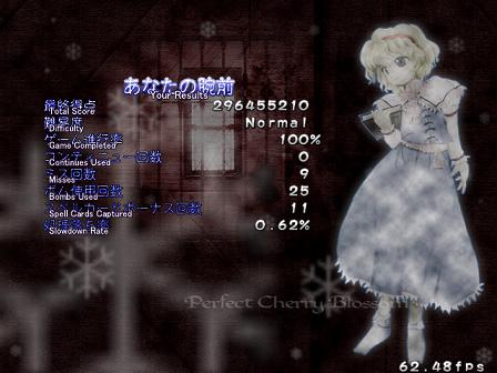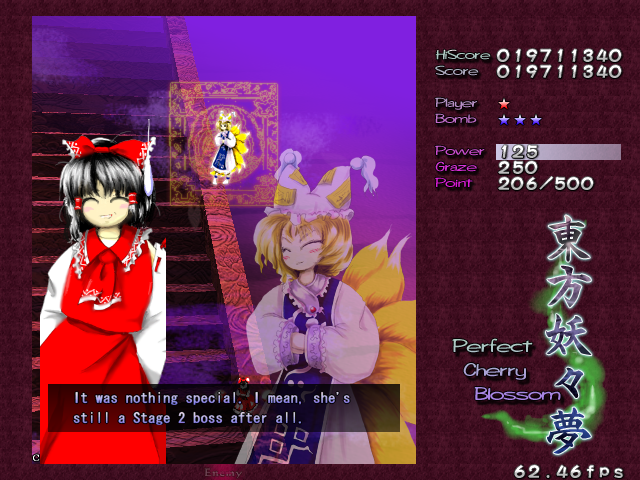 As I have been very reliably informed, ZUN has kindly requested that people don't post the endings to his games on the internet. As well as honouring a simple request, putting the ending here would be a total cop-out, because unlike the other games I play for this website, I had to earn this ending. A lot of games these days hand the ending to you on a silver platter as a token gesture for sinking tens of hours of your life playing it, but Perfect Cherry Blossom demands that you respect it.