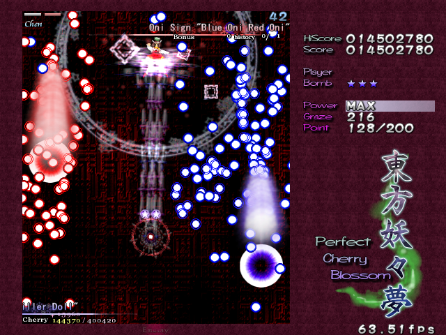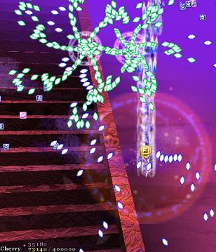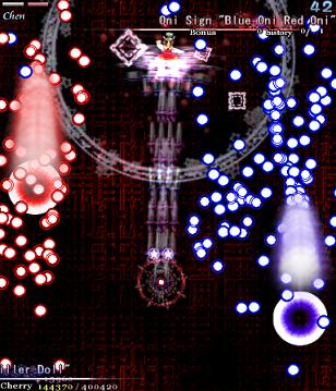 It's also tied for first place as my favourite Touhou game (next to Imperishable Night) because of the Cherry system. No other game in the series (with the exception of Undefined Fantastic Object, which does things very differently) has a score mechanic designed not only with score in mind, but also with the player- unlike most of the others, where mastery of the score system only reaps you the benefit of a higher score, PCB gives the player a helping hand if they learn to reign in the Cherry points they collect, getting the Supernatural Border right where they need it. The game also has, arguably, some of the more interesting non-boss sections in the series.