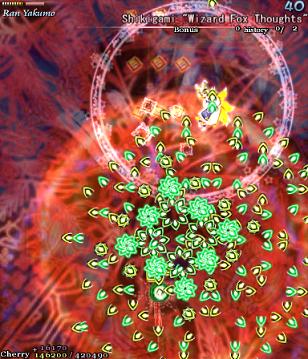 Aaaaand this is where we stop. The Extra Stage is, to put it mildly, cruel. There's a good reason why it's locked away so well- if you can't beat the normal game without continuing, you won't even last 10 seconds in here. There are no continues, there are only 3 lives bestowed upon you, and there is only one difficulty available- you'd assume it's simply called Extra, but I like to call it Cruel Punishment from Above. Just look at those screenshots! If you've beaten the game on Easy to get here, you're in for a nasty shock. After a skirmish with the spiked things from Stage 4 (which also sees the return of the Ping Pong bullets), Chen comes back in this level for Round 2, and she's no longer messing around- she wants revenge, and by God, she's going to get it, and then some. Assuming, by some stroke of luck, you survive Chen's assault, you then get delivered another bullet beatdown courtesy of the fairies, and then Ran Yakumo, Chen's master, shows up- she's not happy you've beaten her subordinate up, and decides to make you pay. I have seen her first Spell Card, and to look at it, even for a second, is to go mad.