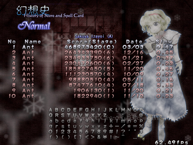 For your amusement, we have a few replays from my successful attempts at beating this game. Shove these into your Replay folder and they should come up in the Replay menu in-game- they're the ones with the player name 'Ant'. Because, y'know, that's me name. The first one is my first time at beating the game, and boy is it awful. Particularly amusing parts to watch out for are when I die on Stage 4 for absolutely no reason, when I totally choke while fighting Youmu, and most importantly, the part where, as the game is ending, I still manage to fluff it up and lose a life. I'm just glad it wasn't my last life, otherwise I fear that all the people who say that video games can't make people cry would've been proven so very wrong. This replay is terrible, I know this, but it's here for laughs.