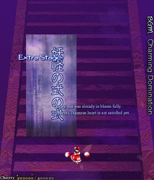The Extra Stage serves as an epilogue to the main game- Yuyuko asks a favour of our heroines, as the border between Gensokyo and the Netherworld is still weak. Yuyuko's accomplice was supposed to fix this, but they haven't gotten round to it just yet. You've got to find them and politely remind them to fix it... By knocking seven bells out of 'em. Standard practice for Reimu, of course.