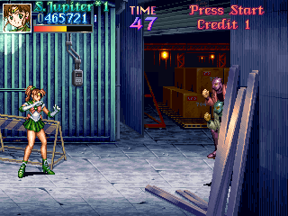 You eventually get to this section, which leads into the final bit of this stage. Now, these guys are a bit weird. For some reason, they prefer to hide behind the wall, and simply don't want to get within a mile of Sailor Jupiter. They actually have to be lured out of their hidey-hole and only then can justice be delivered. Why so shy, guys? I daresay, it could be because she's going to kick the living shit out them... Just a thought.