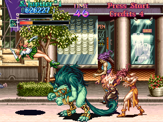 The sight of a perfectly innocent arcade being violated and torn asunder by this once peaceful kitteh offends me to the very core, but I'm going to note that this is Interesting Idea #2, and unlike the first one, I can't think of another scrolling beat-em-up where the idea's been used. Rather than fighting the boss at the end of the stage, you fight it throughout the stage, and when its health gets down to a certain level, it runs away and you have to catch up with it. Admittedly, the stage isn't terribly long, so the boss only runs away twice before you finish it off, but it's a pretty cool idea.