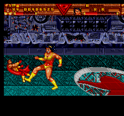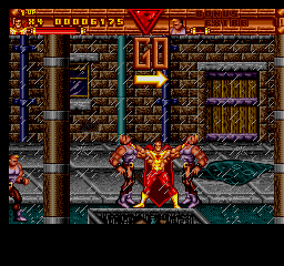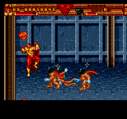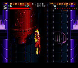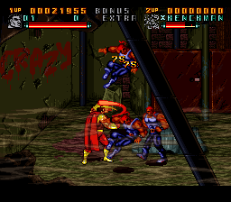 Surprising no-one, the game itself is, well, bad. It certainly is a scrolling brawler, yes, but one that commits pretty much every sin of the genre. Looking at its Western contemporaries (we'll examine that more a little later), it's fair to say only half of its problems can be put down to it not being finished, the rest is falling into bad habits and trends that other games of the time were prone to falling into as well. The structure is of the style of the time, beat up all the enemies then beat up some more, as are the controls, even if it adopts a more Double Dragon-esque separation between punch and kick attacks, which to be fair was in fellow superhero tie-in game The Tick. Probably the most promising element is the throwing mechanics, which could've been neat to mess around with had they actually been finished. The basic idea is to hold the Punch button to grab foes, and from there you can punch them in the face until they die or break free, piledrive them, throw them behind you or throw them into the background. The last two are the important ones- hurling enemies into the background will usually yield items like letters for the elusive BONUS EXTRA (spell both for an extra life) and do a little environmental damage, but more crucially, throwing behind you is your only crowd control attack. You have a screen-clearing super attack, but this is more like the Mutant Power attack from Konami's X-Men as you only have a limited stock, but you can't even trade in your health for extra uses.