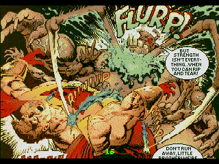 Taking a moment to talk about the game's presentation before we're done, the graphics are the other area where Prime shows it probably wasn't finished up properly before release. Prime himself has a lot of animation frames but the enemies are not so lucky, as not only are some missing the aforementioned grabbed / thrown sprites, some of them don't even have fallen / dying sprites- they just blink out of existence in their idle pose! Furthermore, the game's resolution is all over the place as exhibited by those black borders but also by other odd underscan elements like parts of the background separated from the rest that can be seen on real hardware too (at 8:45- Act 1 Scene 3 and 28:47- Act 4 Scene 2). On the plus side, there are some fairly nice-looking bits of art used for post-stage cutscenes that looks like they're straight out of the comics (some straight-up are, but there's a few we couldn't place), done in only slightly by the Mega-CD's colour limitations. The rest of the game's graphics, though, aren't particularly noteworthy.