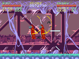 What you really want is the Red Protein which only appears after you've reached maximum power through three Yellow or Blue Proteins- grabbing one changes your appearance more dramatically and gives you the max melee and max projectile upgrades (now with double the amount of projectiles, firing both in front and behind you) at the same time, turning you into an nigh-unstoppable killing machine. Maria in particular becomes pretty busted and overpowered because of her homing shots and her new wings allow her to slow her descent from a jump by holding the button down, allowing her to skip certain sections and dodge enemies more easily. Ryo doesn't get any of that, but he'd sure be good in a fighting game with all that anti-air range. The catch is if you take three hits in this form you go back to the basic melee weapon which is extremely bad if, say, it happens during a boss fight. Which it will because the hit detection is all over the place in this game. If nothing else, this makes playthroughs require a certain level of strategy and planning ahead- the lifebar is pretty generous so you have to gauge whether you should take hits now to power down and get a fresh set of hits by powering up if you have enough enemies left to kill in a stage to reach that poiint before the boss.