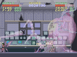 The level design is all over the place too, with little cohesion or thoughtful layouts, almost like it was thrown together hastily. A prime example is Track 4 Chapter 2 which is the type of stage all platformer game players dread, a vertically-scrolling area where you have to clamber up small platforms. However, there's no rhyme or reason to their placement, plus the game makes you get dangerously close to the top of the scren to make it scroll so you're likely to just blunder into enemies. There's a similar section later in Track 6 with Mega Man-style platforms that shift in and out of existence but unlike that game there's no logical sequence to when the platforms disappear or where they're placed, they just all do whatever they want. Some areas are also very poorly considered in some regards- Track 5 is an auto-scrolling runner section like the running sequences in Alien Storm, but while enemies do drop Proteins as normal, you can't actually grab them when they drop because they scroll off-screen too quickly, and the elevator sequence in Track 1 has a similar problem, just with items scrolling up off the screen instead. Finally, whole areas are frequently repeated too- Track 2 has several subway tunnels that are just a straight run to the end, Track 3 has two near-idential elevator sequences where you have to destroy enemy-spawning pods that take way too many hits to destroy (the only differences between the two is sometimes the second elevator spawns a flying enemy) and Track 6 has two long areas where you have to destroy pulsing orbs to s-l-o-w-l-y remove veiny blockades while being attacked by Life Force-style flesh wall nails and arcing flames, the only change being the direction you head in. There's a promotional video you'll see at the end of this article that makes me wonder if the game was originally more ambitious with its level design- Track 1's elevator sequence was originally more complex than what the final game got.