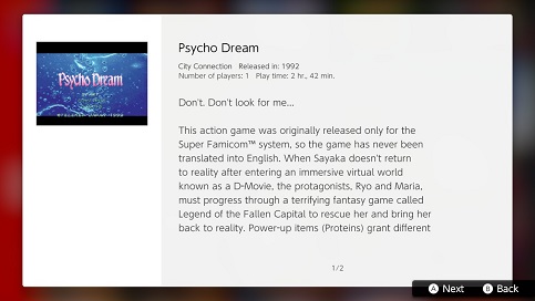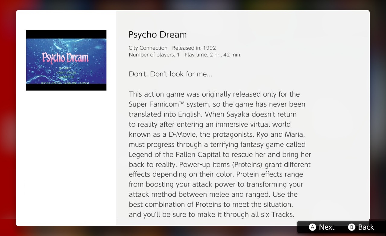 ... Well, we can find out now if that's true as somehow Psycho Dream did get a Western release almost thirty (30) years after it first came out in Japan. The game was added to all versions of the Nintendo Switch Online SNES app in February 2021, with an English story blurb available on the app's menu but otherwise untouched for Europe and the US. Funnily enough, the same month the app also got Doomsday Warrior. Those two games are just cursed to forever be together, huh.