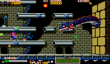 | ![]() Oh, poor Kensou. They couldn't even decide how to translate his name at this point, it's spelled Kensu in this game and Kensou in his later reappearances in The King of Fighters. Kensou is the man who never wins- you can't play as him without specifically starting a two-player game with two credits, he's kinda treated as a joke in The King of Fighters (has a bunch of goofy animations, loses his psychic powers at one point, has an unrequited Thing for Athena, isn't as broken as Chin in '96 is) and even in Psycho Soldier, there's bits here and there where he gets screwed over, as we will see. Poor guy. |