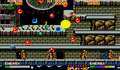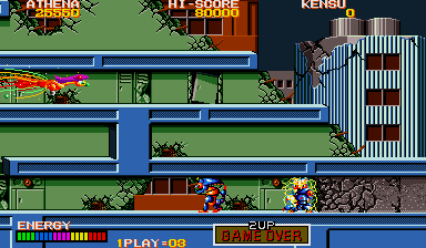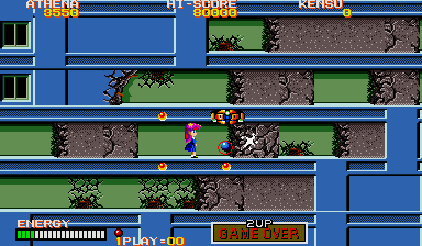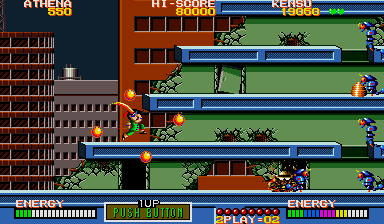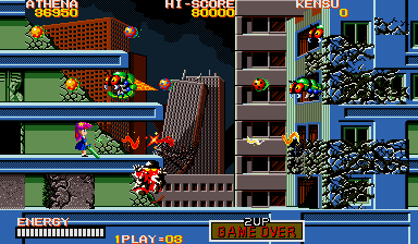 The first stage is a typical post-apocalyptic city overrun with nasty bug-like aliens, but that's not the first thing you'll notice upon starting the game, and neither will you pay attention to the fact that Athena starts every life flying around in a little UFO. No, no, the first thing you'll notice is the music, because as the flyer enthusiastically states, "OH! ATHENA IS SINGING! ATHENA SINGS LIVELY". What that means is Psycho Soldier is the first video game with a vocal song, sung in the Japanese version by Kaori Shimizu, an idol active between 1986 and 1991 (JP Wiki page here), but if you're playing the English version, it's translated and sung by an unknown individual. Well, 'translated' in the loosest sense of the word, it's in English but has no relation to what's being sung in the Japanese version (which explicitly refers to Psycho Balls, nowhere in the English version). To pull this off, SNK created a monster setup that's actually three PCBs sandwiched together. All for one vocal song. I mean, if you're gonna add something like this, you may as well go all-in. When you first listen to it, it's not great- there's no way they could get cassette-quality here, this ain't no Journey or NATO Defense- and while it's playing it stops Athena and Kensou's sound-bites from playing! A tragedy! When the song eventually loops, it'll play an instrumental version, which is a little easier on the ears when you first hear it, at least.