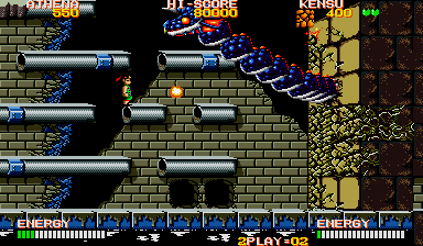 Incidentally, Kensou has the same power, but he turns into a Chinese dragon with exactly the same abilities. However, grabbing the Flame Orb is far more entertaining in two-player mode, because if the non-monster player taps Up while near their partner, they'll jump onto their back for a little ride. From there, they can fire shots and Psycho Balls while the other player moves around the screen (and they can tap Up again to get off) but this probably does you more harm than good- unlike their transformed friends, players riding around like this are still vulnerable to enemy fire, so if your partner is going on a genocidal rampage (as any sane person would when transformed into a giant fire-breathing monstrosity) and darting all over the screen, they're probably not thinking of their rider's well-being, so you'll almost certainly die. Still, it's a neat little touch.