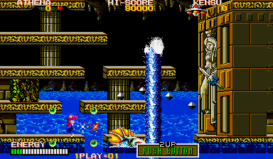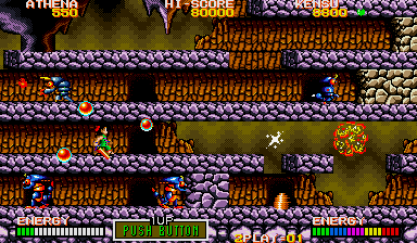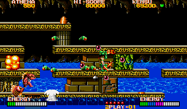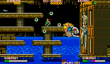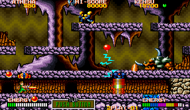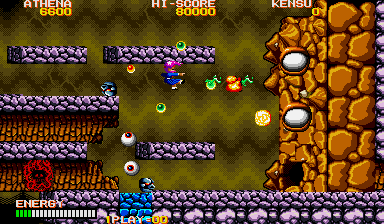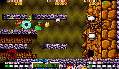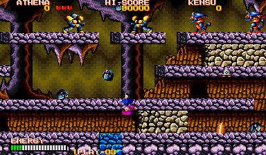 This is pretty much the turning point of the game, as from here on out the kid gloves are well and truly off, and Psycho Soldier gets nasty. The enemies are much more aggressive and numerous, and two of the new enemies that appear are absolutely vicious- the Head Guys and the Triceratops. The Head Guys are particularly obnoxious, as they rip their head off (?!) and throw it, leaving it to roll on the floor, then grow another head almost instantly, throw it again, and repeat until they die or they're off the screen. If you've only got the basic shot, it'll take three shots to destroy each head, and if you leave them alone for more than a few seconds, the screen will be be filled with rolling heads. Amusingly, the best strategy is to destroy the body first rather than the heads, which goes against that old axiom. Well, it made me laugh.