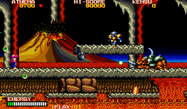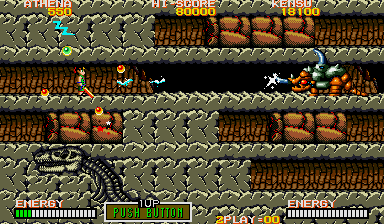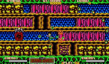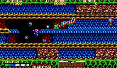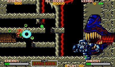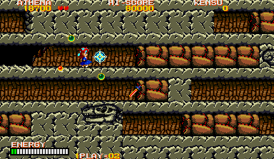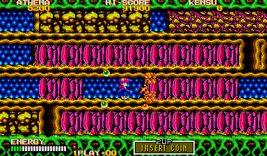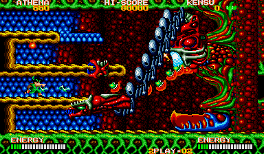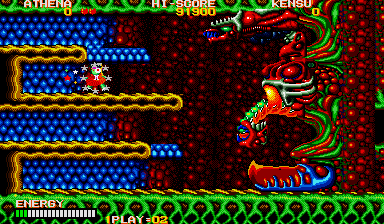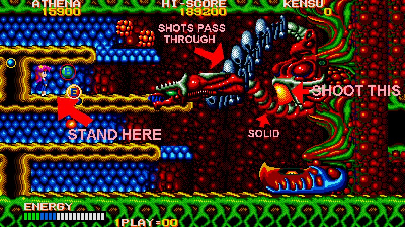 In theory what you need to do is put yourself where Athena is in this enlarged screenshot, and make sure to press yourself against the wall, then turn around and face your enemy. From here, you can shoot at the chest through the neck, and also avoid the head lunge fairly easily- if it lunges at this particular row, it will never pass through the one below it on the way back (it always uses the top row) so just hop down a row, then get back in position when it's safe. Do the same if a spiky thing or fireball heads your way (you can also go up to avoid the fireball, but watch out for the lunge). From here, you can also easily grab any bonus E and B symbols (should they appear) and if you ever find yourself in a real jam, you can just use the Psycho Ball's temporary invincibility to avoid getting killed- you won't be using them against the boss itself, trust me. If you're at full shot power, then keep this up and the final boss will die.