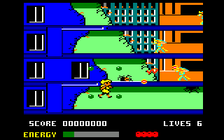 Finally, the Amstrad CPC version certainly looks like it's the best- it's a much brighter version of the C64 game, and it's got a much snazzier title screen. Unfortunately, looks aren't everything, and the Amstrad version is, by far, the worst version of the game. It's nearly unplayable. In fact, it makes the NES Athena look like a masterpiece in comparison. The automatic scrolling from the arcade game is completely gone, replaced by awkward flick-screen action, it's monstrously slow, the enemies will kill you even quicker than in the arcade version, and it's just an absolute mess. I'm amazed that this was even released, but then again, this was the late '80s home computer market in England, and so anything goes. SQIJ! was released, for instance. Ahem.