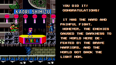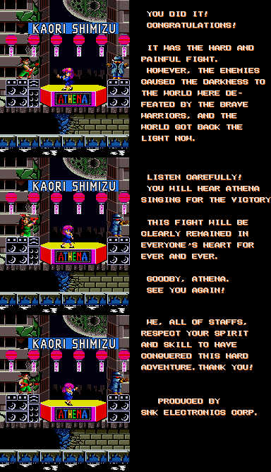 Presented, for the first time on this site, in full! On the older version of this page, we tried in vain to get this properly animated. Back then, our screenshot process was long and arduous, involving us hammering on MAME's screenshot button like we were playing Track & Field then converting each shot into .bmp format one by one, so basically the worst possible way to do it. So we gave up trying to get this bit done properly, and ended up giving you only ten frames of animation. Now though, now our animating process is turbo-powered, allowing us to give Psycho Soldier's ending as many frames as it needs (over 500 in this case, but compression makes our life even easier). Please, enjoy Athena's lively dancing while the Psycho Soldier theme plays (in your head, we haven't ascended to the level of proper embedded videos... Yet) and the text scrolls by. You may also notice an urge to grab a glowstick and purchase Athena merchandise while listening to this song, and that's when it hits you, it finally happened, you've become Idol Trash, this is how they get you, but it's OK, you can join us and join us in Idol Hell forever.