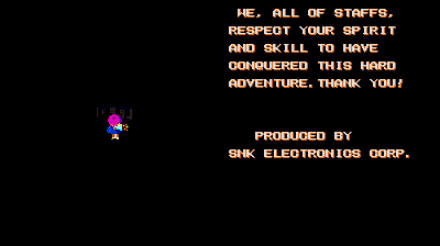 Ahem. Anyway, the ending text is, of course, in SNK's standard English. Less hot dog references than their Neo Geo translations, but good enough.